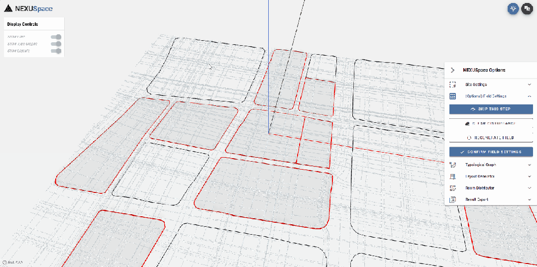 (3)生成体量与功能布局。学生结合方案试做的中期成果,在NEXUSpace中导入地块划分结果,指定各栋建筑的形态类型,并输入房间分配的任务计划表,得到各个地块的体量和功能布局结果;
