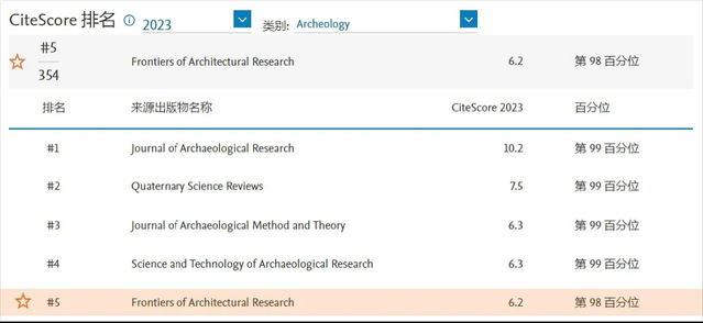 ▼ 2023年度FoAR CiteScore 指数在考古学领域排名超过98%的期刊。