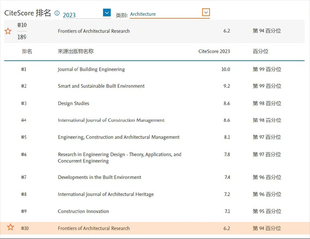 ▼ 2023年度FoAR CiteScore 指数在建筑学领域排名超过94%的期刊。