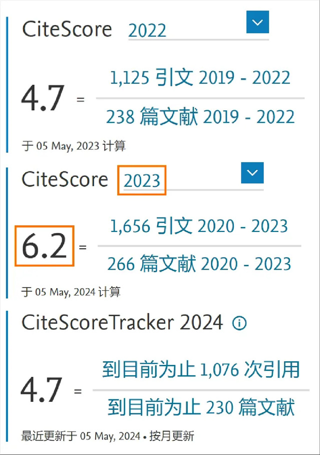 CiteScore是Scopus数据库酝酿多年,于2016年12月推出的引证指标。与影响因子计算近两年引用率的方法相类似,CiteScore改进了算法,可以有效衡量某期刊近四年(包括计算年)发表论文的被引影响力。