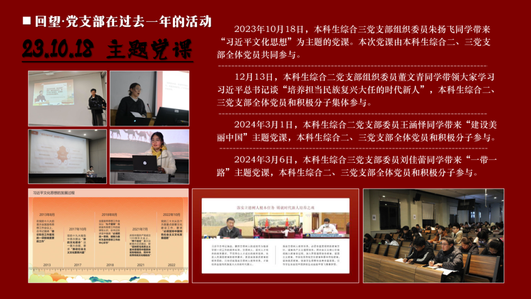 第三篇章,刘学姐首先为大家介绍了我院本科生党支部的基本情况与建设现状。在党支部这个大家庭里,我们可以一起增强政治素养,也能够不断地以专业的视角跟踪时事热点。接着,刘学姐还着重介绍了上一学年党支部开展的学习习近平新时代中国特色社会主义思想为主题的系列党课,引起了同学们的强烈兴趣。