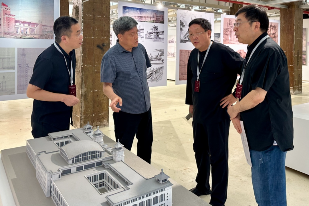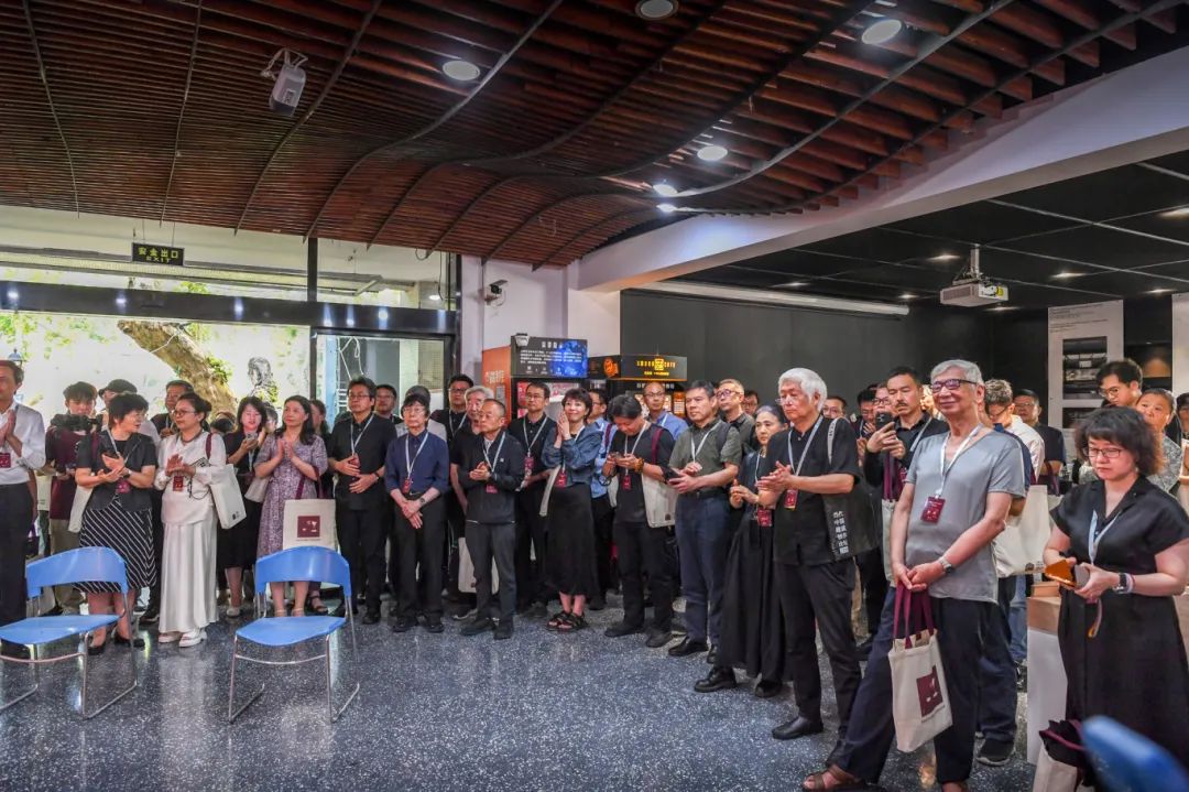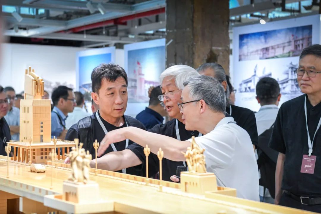 随后,来宾移步展厅参观,韩冬青教授为纪念展做了导览。本次展览整理收录了钟先生生平照片、工程项目模型、画作手稿、教学科研资料以及AI复原的工程项目影像,还特别展出了钟训正先生手书笔记、手绘图纸、绘画作品的真迹以及工作学习中的用品用具,从不同侧面记录了钟训正先生在建筑教育、建筑创作和建筑绘画等方面的非凡学术成就和艺术造诣。
