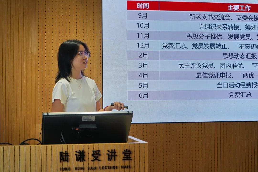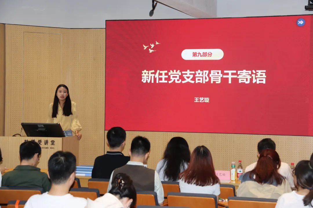 党委秘书史婉莹同志首先对学院党委及各支部的组织结构进行了简要介绍。随后,她从职责分工、党员发展以及党日活动三个关键方面,对党支部的工作要点进行了详尽阐述。通过她的讲解大家对党支部工作的全局和细节有了更加深刻的认识。