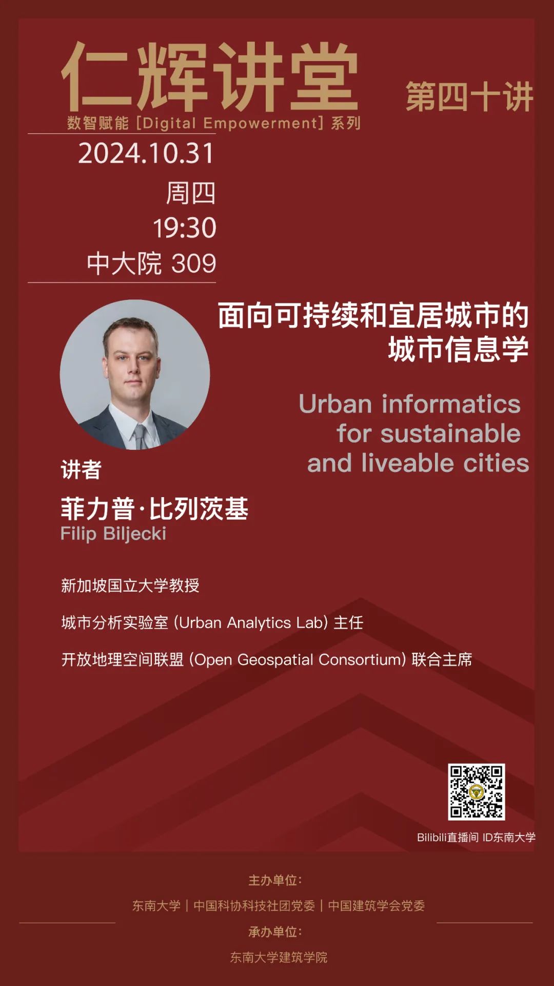 尤其是近几年数字技术、人工智能所带来的创新思维和应用,促使古老的建筑学直面机遇和挑战,加快转型,探索新的学科边界。为此,从今年开始,仁辉讲堂增设“数智赋能(Digital Empowerment)”系列,展现国内外最新成果。本期仁辉讲堂,由新加坡国立大学(National University of Singapore)菲力普·比列茨基(Filip Biljecki)教授主讲,采取线上线下同步直播的方式开展。