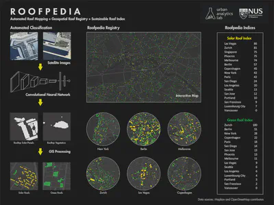 Roofpedia is an open registry of sustainable roofscapes around the world. It uses deep convolutional neural network to detect sustainable roof typologies from satellite images. Footprints of buildings identified with solar panels or rooftop greenery are tagged automatically, and the results are visualized above for a score of cities.