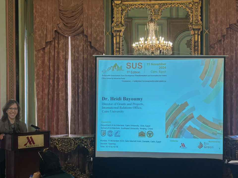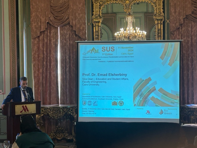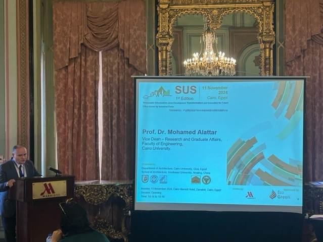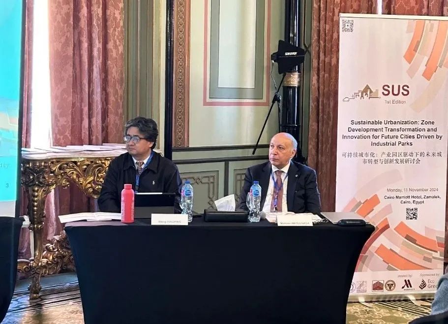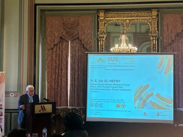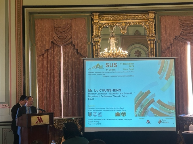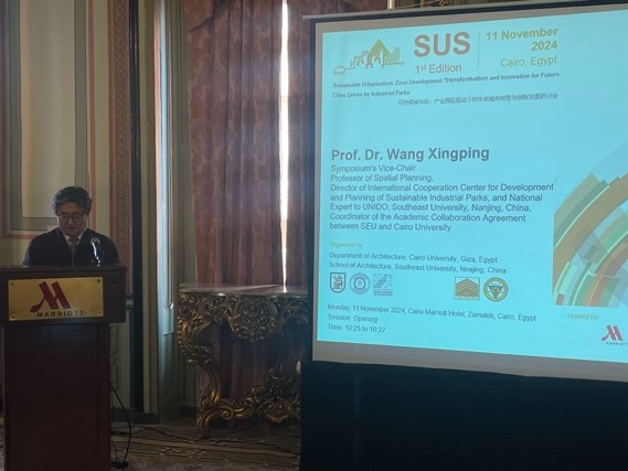 2024年11月11日埃及开罗当地上午九点,开罗大学工程学院建筑系与东南大学可持续产业园区发展与规划国际合作研究中心联合举办了“可持续城市化:产业园区驱动下的未来城市转型与创新发展研讨会”。本次会议作为双方合作承担的国家社科基金重点项目、国家自然科学基金等科研项目的相关学术会议,旨在促进国际合作与交流,探讨如何通过产业园区的高质量发展推动城市可持续转型与创新发展。会议邀请了埃及外交部前副部长、前驻华大使、中埃友好协会副会长H.E.Aly EI-Hefny、中国驻埃及大使馆教育与科技公使衔参赞卢春生、开罗大学工程学院副院长Mohamed M.Elattar教授、开罗大学工程学院副院长Emad A. Elsherbin教授、开罗大学国际关系办公室奖学金与项目处主任Heidi Bayoumy博士、中国城市规划学会常务副理事长兼秘书长石楠(视频),Eco-Green总经理Mostafa Mourad、巴勒斯坦安纳扎赫国立大学(An-Naiah National University)AliShaban H. Abdelhamid教授等嘉宾以及中埃双方相关专家出席。团队合作伙伴、开罗大学工程学院建筑系教授、UNESCO包容性政策实验室专家、开罗大学-东南大学学术联合协议合作者Mohsen M. Aboulnaga作为研讨会主席,东南大学可持续产业园区发展与规划国际合作研究中心主任王兴平教授为研讨会副主席,共同主持本次会议。本次会议包含开幕致辞、主旨报告和主题论坛等环节。
