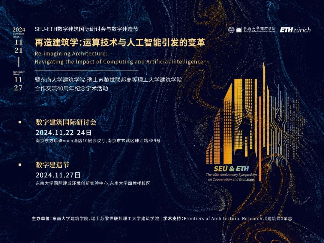 2024年是万博manbetx官网 和瑞士苏黎世联邦高等理工大学万博manbetx官网 合作交流40周年。11月21日-27日万博manbetx官网 与瑞士苏黎世联邦高等理工大学万博manbetx官网 将在东南大学举办主题为“再造建筑学:运算技术与人工智能引发的变革”的数字建筑国际研讨会与数字建造节。
