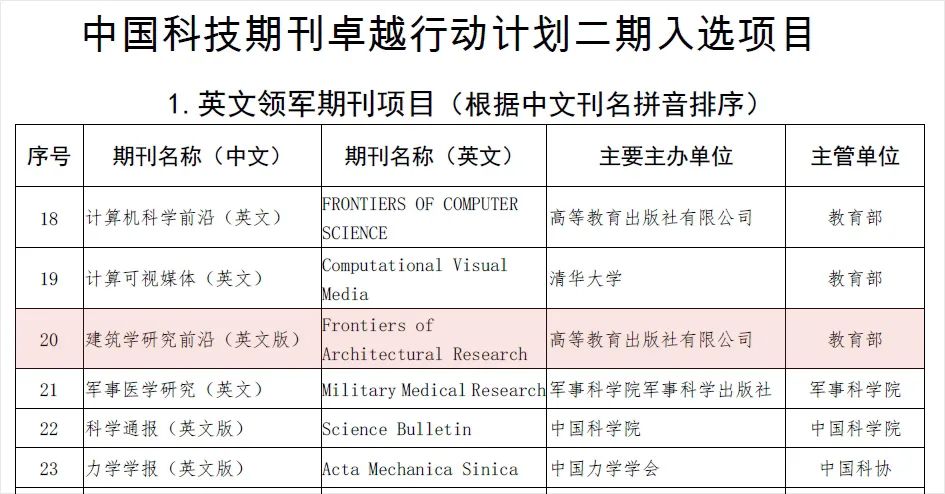 今日,中国科技协会正式公布了“中国科技期刊卓越行动计划二期”入选项目。Frontiers of Architectural Research (高等教育出版社和万博manbetx官网 联合主办) 入选英文领军期刊项目。