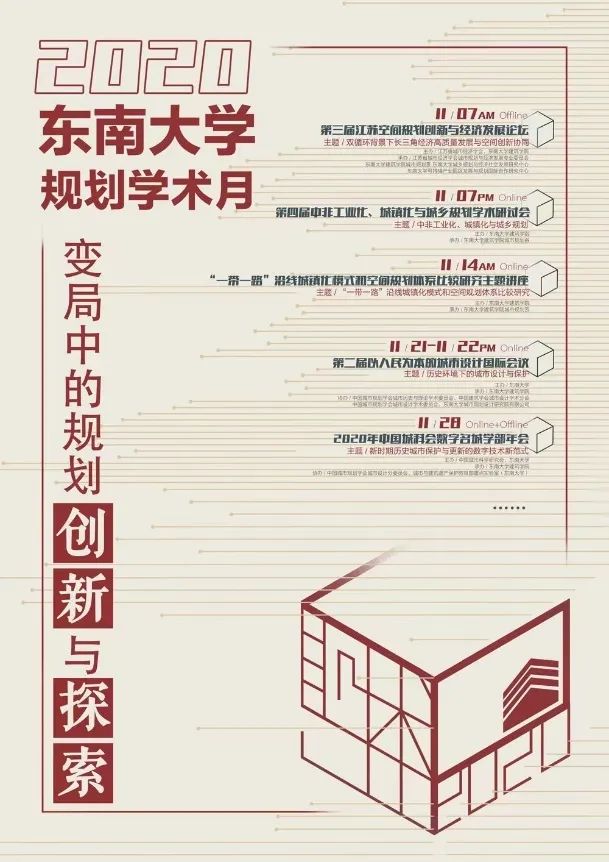 在城乡规划学科转型发展的深刻时代背景下,深度与密切的学术交流将日益成为撬动学科创新、融合与进步的关键支点。东南大学城乡规划学科在历史传承中始终坚持倡导学术自由,鼓励学术争鸣,以积极的国内外学术交流启迪学科发展。为在新时代进一步推进规划学科的转型与创新,本学科自2020年起每年组织“东南大学规划学术月”活动,邀请国内外学术机构与同行,集中举办学术会议、专题讲座、学术对话、成果发布等活动,围绕国内外规划学科发展前沿、国家城乡建设重大需求和健康宜居城乡生活营造,积极开展科研成果交流,促进科研合作,活跃学术氛围,为国内外规划学者构筑学术交流的新平台,共同促进学科的发展与繁荣。