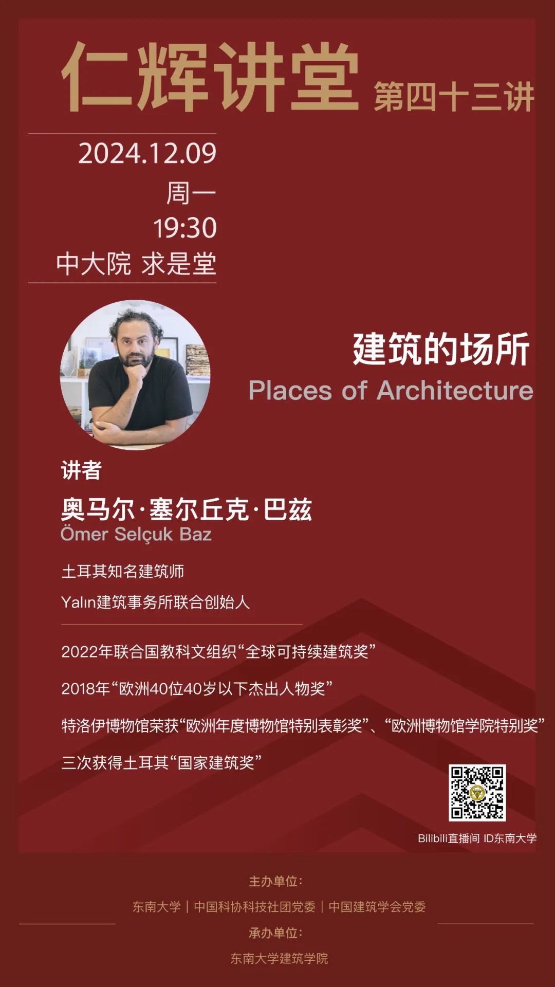 杨廷宝先生,字仁辉,是我国著名建筑学家和建筑教育家,东南大学建筑学科创立的一代宗师。2021年杨廷宝先生诞辰120周年之际,为传承和光扬先生的学术精神,万博manbetx官网 开设“仁辉讲堂”,长期延请国内外著名学者、建筑师举办讲座,弘扬学术,激励后学,推动中国建筑和建筑教育事业的蓬勃发展。本期仁辉讲堂,由土耳其知名建筑师,Yalın建筑事务所联合创始人奥马尔·塞尔丘克·巴兹(Ömer Selçuk Baz)主讲,采取线上线下同步直播的方式开展。