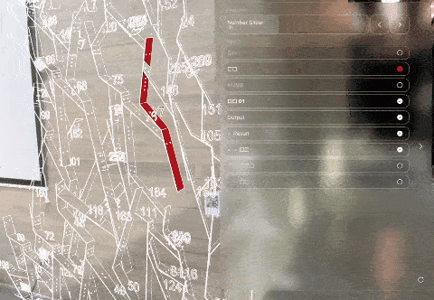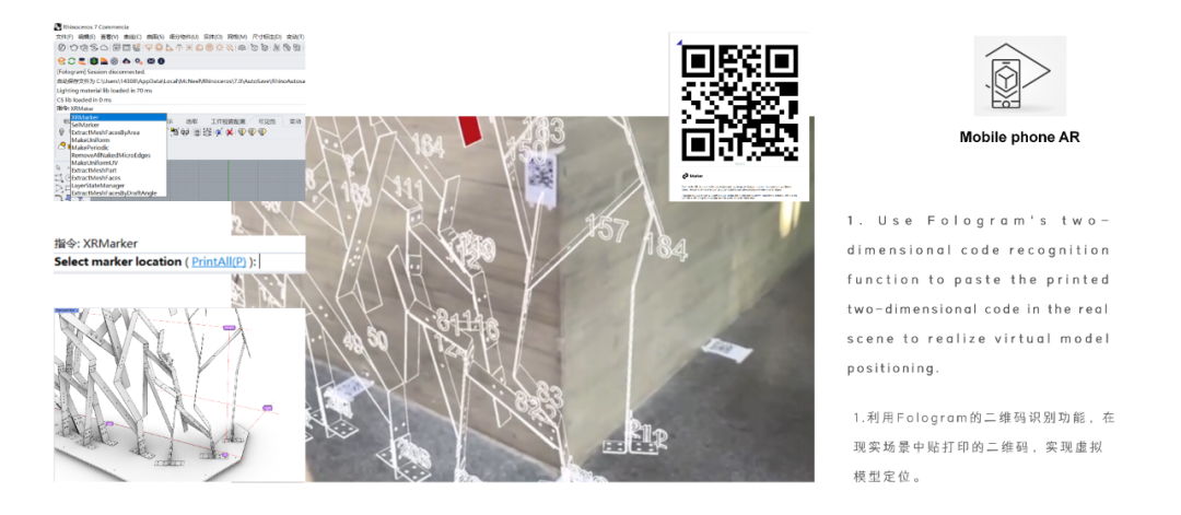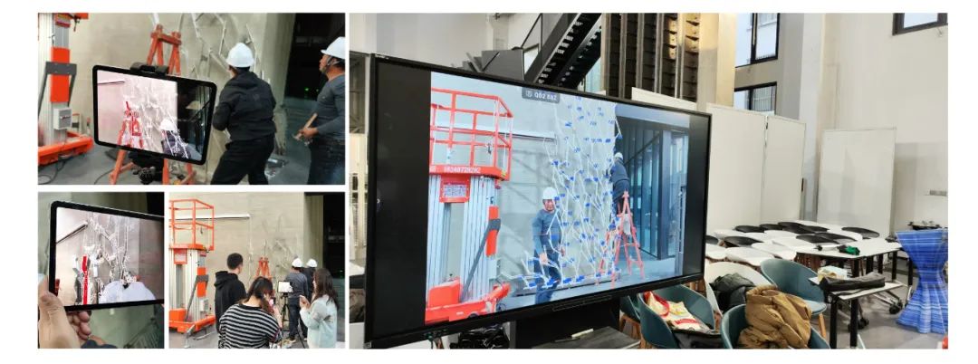 在虚拟模型中设置四个定位点并开发编号系统,通过高亮显示选定构件,便于操作人员识别。建造过程中,利用Fologram平台进行空间校准,两台iPad协同辅助装配:固定设备投射整体模型信息,监控全局;手持设备展示局部细节,直接指导操作。这一基于混合现实技术的多设备协作方式显著提升装配效率与精确度,降低施工错误率,实现设计与建造的动态反馈与精准衔接,为复杂建筑施工提供了重要参考,推动生成式设计与数字建造技术的发展。