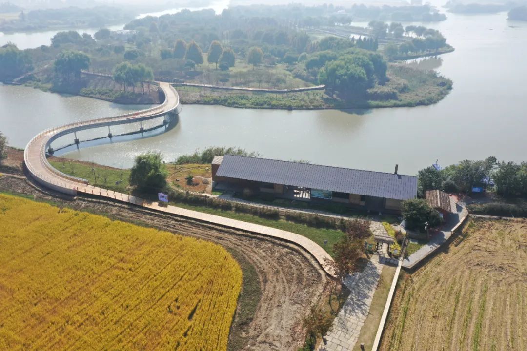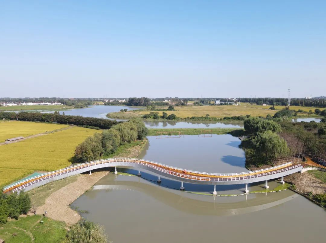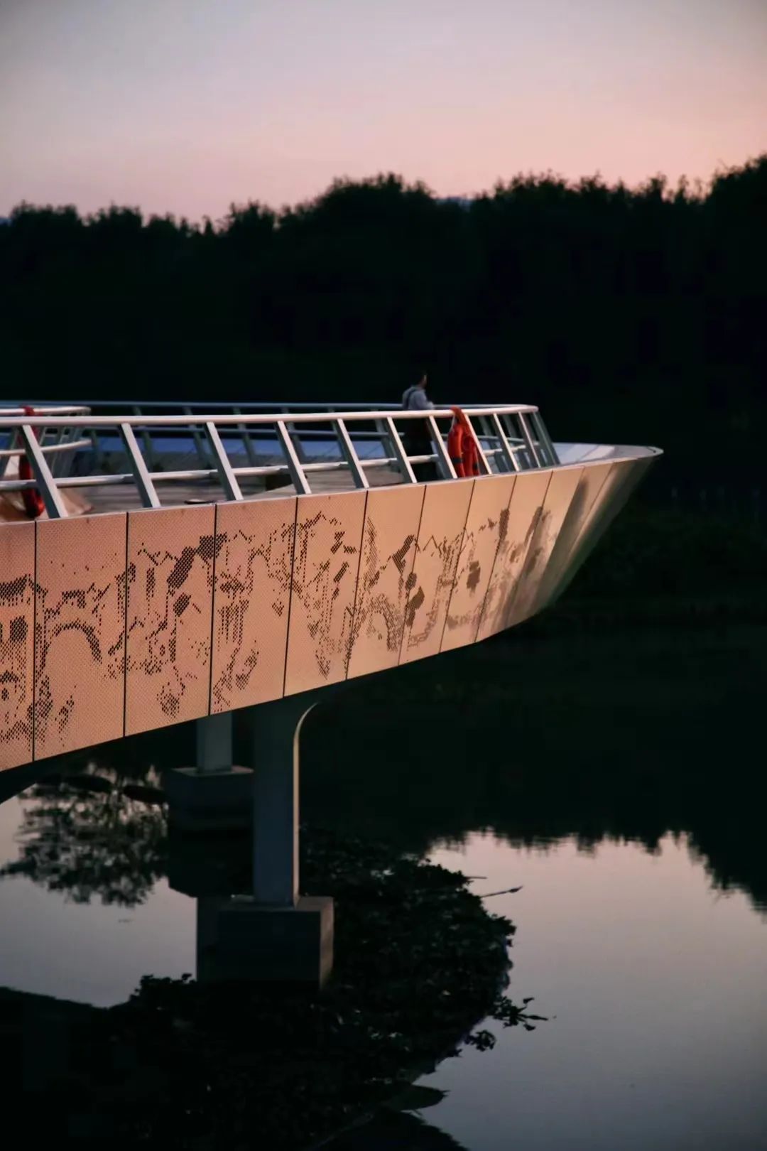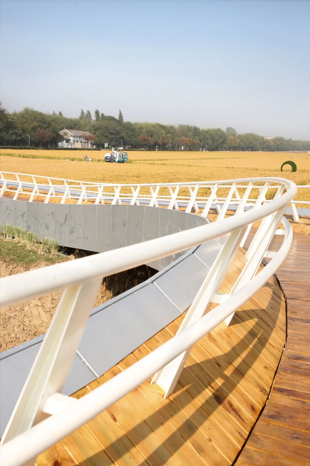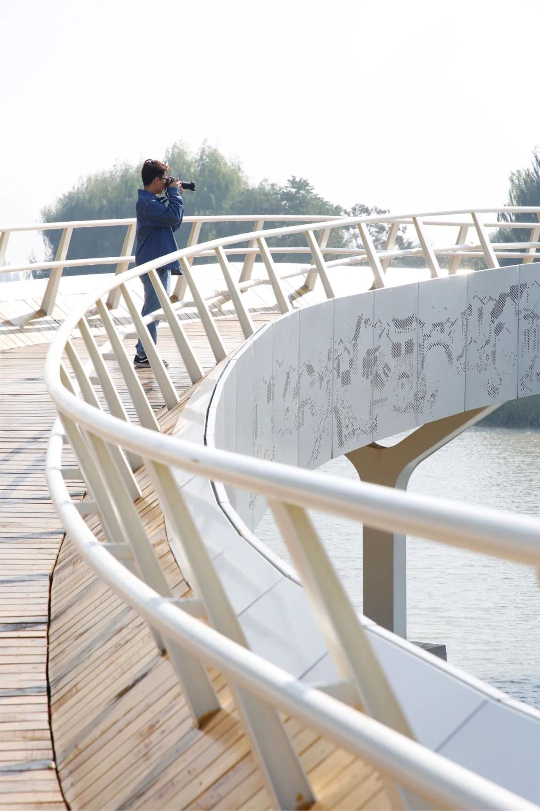 步行桥项目位于风景秀丽的丁蜀镇莲花荡景区,连通了千亩生态农田和莲花荡上的湖心岛。设计目标是充分利用莲花荡的自然景观,满足交通、游览和停留的需求,以提升游客的观光体验。设计团队采用数字链的方法完成形态、结构一体化设计和装配,借助数字建筑技术展现独特的水乡文化。通过数字生形技术,精心雕琢桥身的流畅曲线,仿佛是一条银色的丝带从金黄的稻田蜿蜒而行,轻柔地连接着湖心岛和岸边。曲线的造型延长游览路径,并丰富游客的视觉体验,桥身在转折处向外延伸,与远处跨湖而过的火车遥相呼应,为游客提供了一个理想的观景点。利用参数化工具,以基准曲线为基础,生成变截面桥体的桥面、栏板和栏杆扶手,引导着视线向远方延伸,实现了视觉上的连贯性和美学上的和谐统一。连续曲线桥被解构为十个平滑衔接的弧段,与桥墩一一对应。每段桥身都拥有独立的结构和构件,确保了现场快速装配的可行性。桥身外侧的装饰穿孔板则巧妙融合了数字化设计与江南传统绘画艺术。灵感来源于画家吴冠中的多幅水乡水墨画,通过穿孔孔径的变化,描绘出江南水乡风光。利用生成设计与数控加工的数字链流程,确保了工艺的精确性和设计的创新性。
