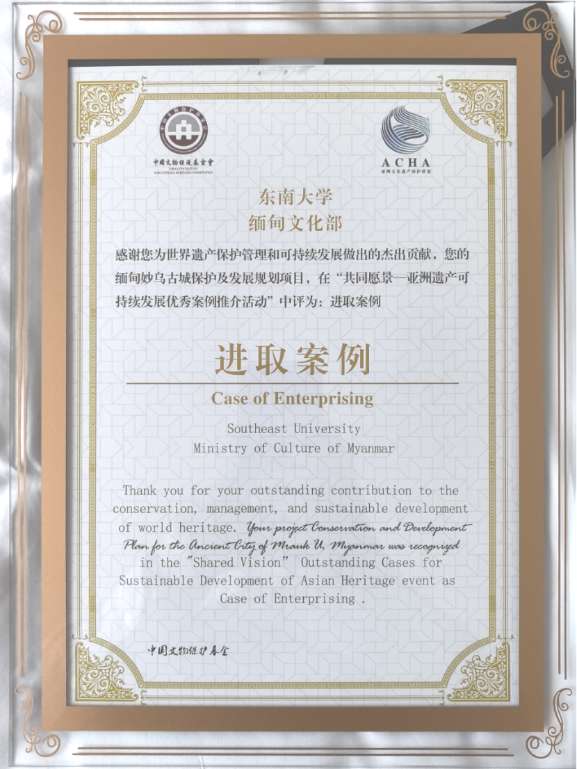 2025年2月28日,“2024共同愿景——亚洲遗产可持续发展优秀案例”发布会在云南省普洱市举行。该项目在国家文物局指导下,由中国文物保护基金会、亚洲文化遗产保护联盟联合主办,旨在挖掘亚洲地区值得推广的优秀遗产保护经验,遴选和推介优秀的遗产保护与创新实践。总计12个遗产保护项目从23个国家、218份申报项目中脱颖而出。东南大学、缅甸宗教事务与文化部共同申报的《缅甸妙乌古城保护及发展规划》项目凭借其在国际合作方面的创新探索,获评为“进取案例”。