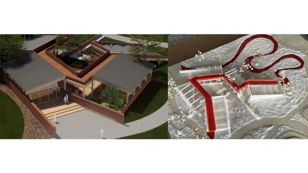 刘望辰同学以微地形搭配丰富植被优化环境,建筑概念来自江南园林中常用的曲廊回院,创造借景框景,并通过钢框架结构体量旋转形成体块咬合、掏挖的空间透明性效果,满足不同的功能需求。将来可以更细致推敲空间尺度与感受。