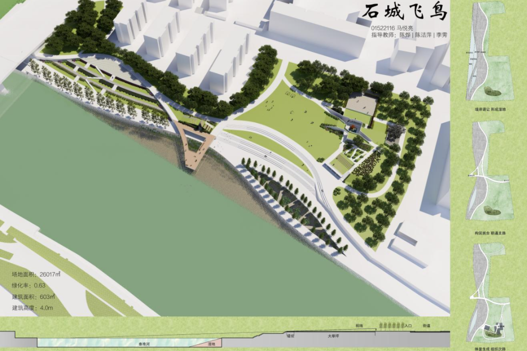 通过场地调研,同学们总结了场地具有位于秦淮河风光带的区位优势、文化底蕴强、人群活动丰富、微地形环境绿化茂盛的优势;但也有交通流线混乱、岸线生硬、景观空间利用不充分的问题,面对秦淮河水位波动的威胁,结合防洪规范提出适度改造防洪堤柔化水岸,激活水边活动的场地设计策略,并为景观建筑衔接城市街道与滨水空间,留出布局空间。