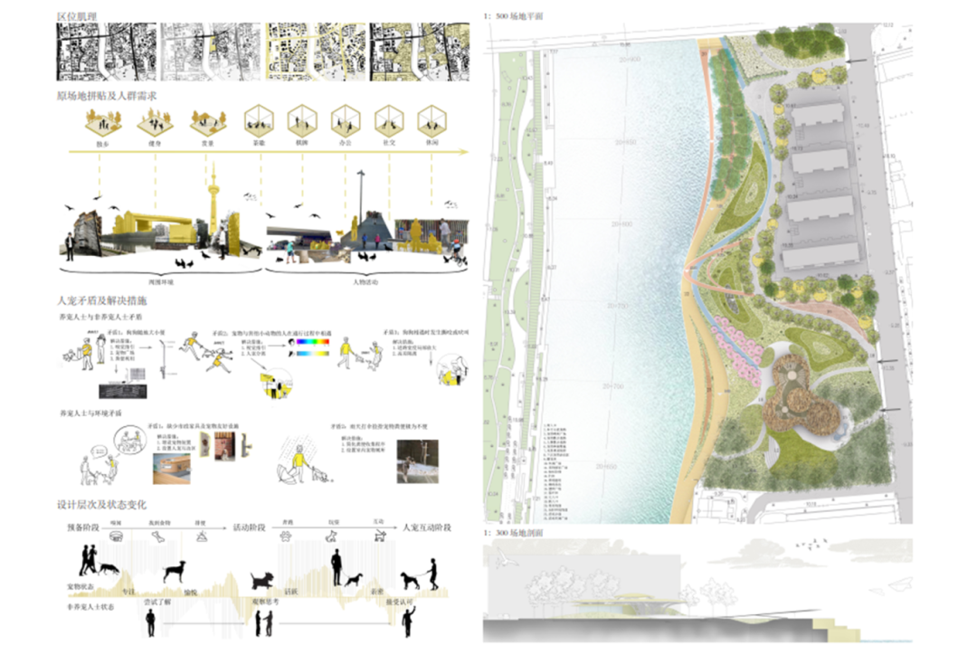 龚婉纯同学将童年爱宠的梦想与公园日常使用的多元体验场景结合塑造了一个社区人宠互动活力公园。用合理分区、地形改造与流线组织化解爱宠人群与惧宠人群的矛盾,用亲切的竹材和自然形态让游客体验自然和多样的玩法。柔性竹材的结构体系推敲不易,感兴趣未来可以继续。