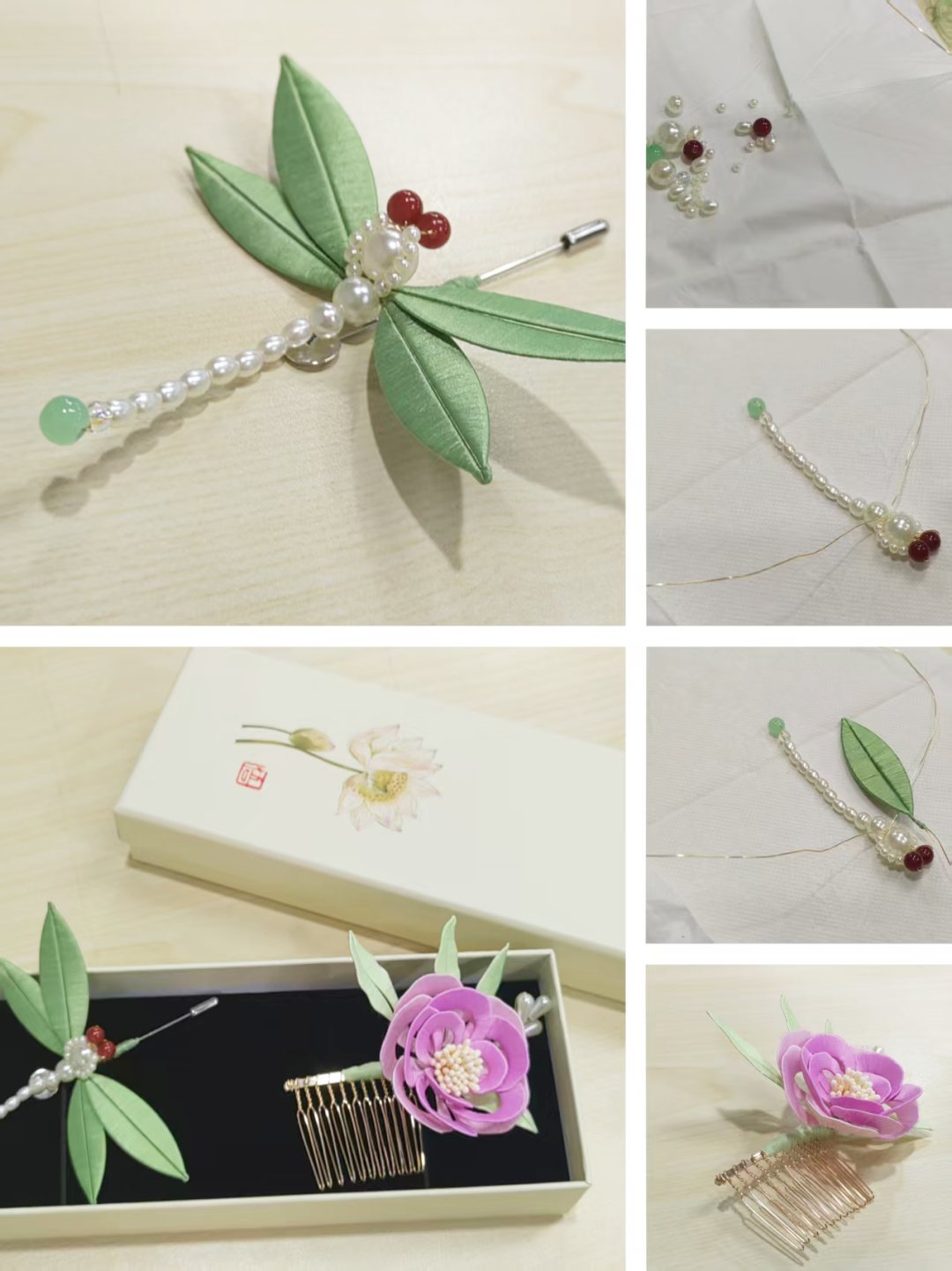 在视频教程指导下,女教职工们使用统一发放的材料包,尝试制作蜻蜓胸针或多宝竹叶缠花作品。从铜线串珠固定蜻蜓身躯,到缠绕丝线塑造翅膀纹理,每一步都需细致耐心。活动现场,丝线、铜线、卷尺、剪刀等工具在参与者间传递共享,合作氛围温馨融洽。