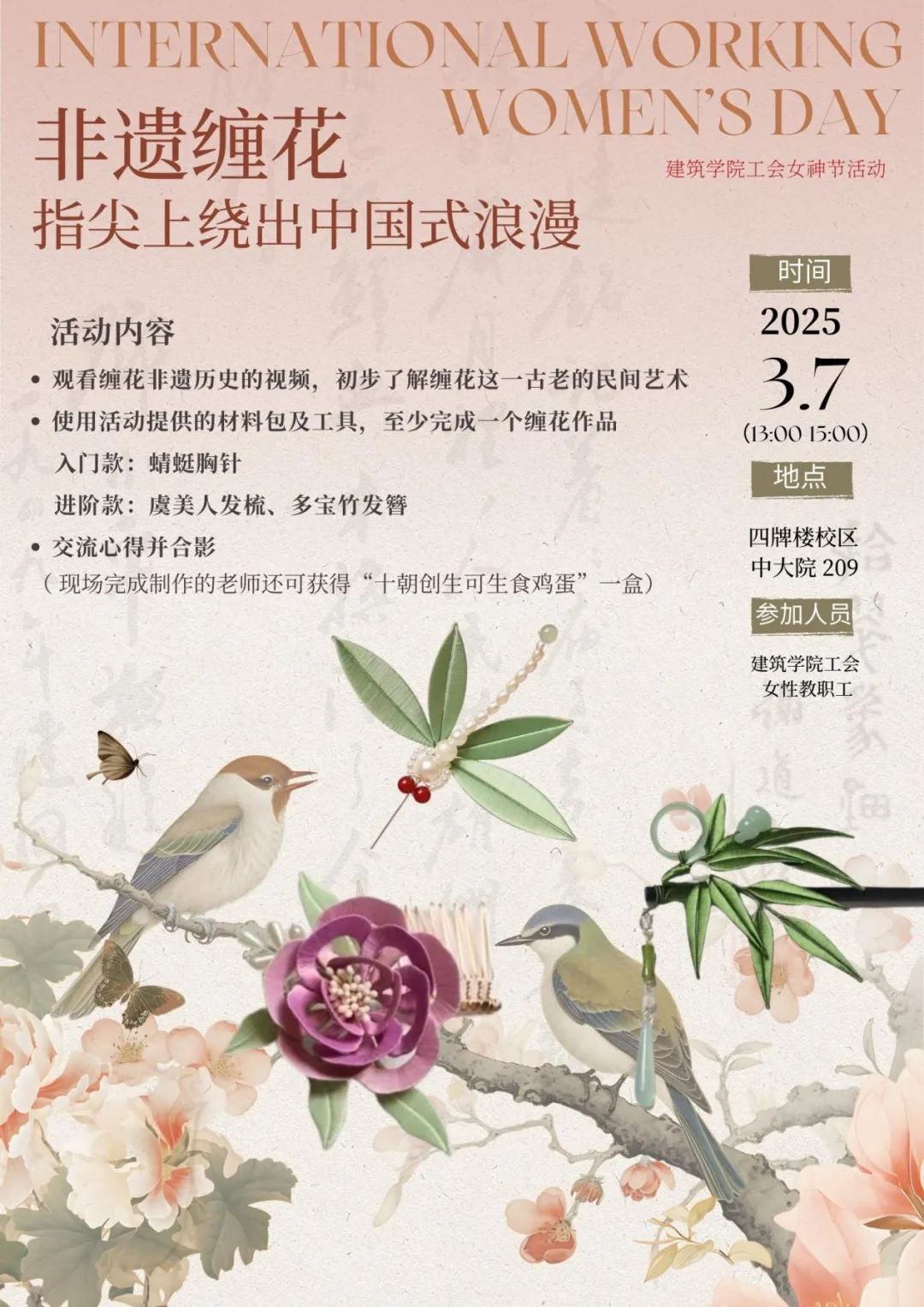 在2025年“三八”国际妇女节来临之际,万博manbetx官网 工会以一场别具匠心的非遗缠花手工活动,为全院女教职工送上节日祝福。3月7日下午,20余名女性教职工齐聚四牌楼校区中大院209教室,在丝线与铜丝的缠绕中感受传统技艺的魅力,亲手制作“永不凋谢的花”,体验指尖上的中国式浪漫。