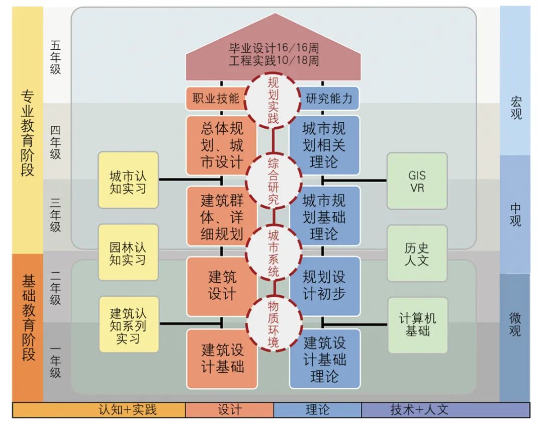 城乡规划本科人才培养则强调与注册规划师制度相结合、与国际先进城市规划教育相接轨。在保持物质空间规划传统优势的同时,提出在建筑学背景下融入区域与政策观念的城市规划人才培养理念,并建立“政策研究与物质空间规划设计并重”的现代城市规划教育模式。该模式以复合型综合能力和创造性自主能力的培养为核心,突出博雅教育与职业教育、素质教育与专业教育的有机融合。