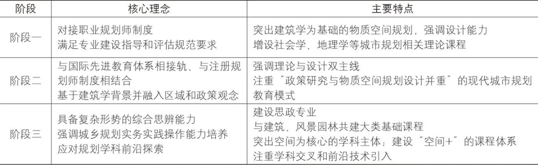 ▲ 表1 1998年来东南大学城乡(市)规划专业人才培养方案的核心理念及主要特点