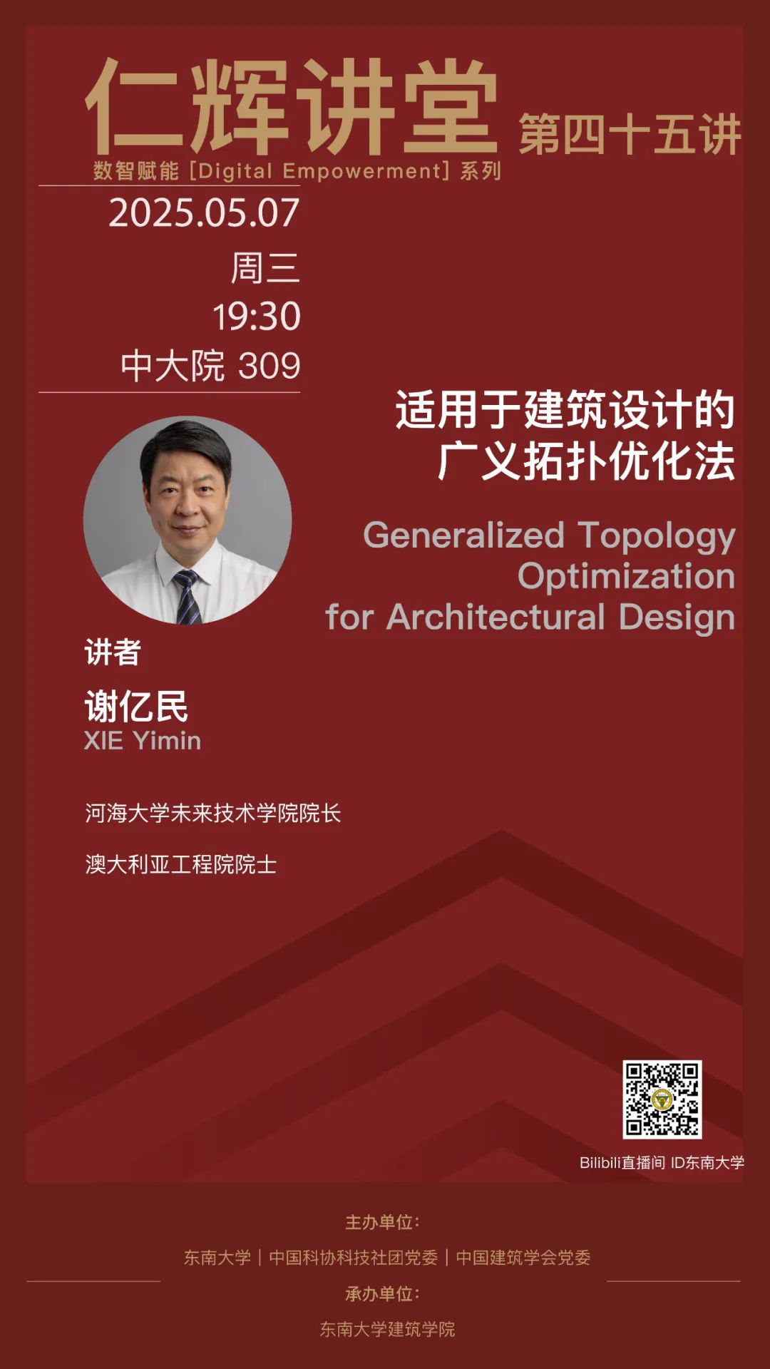 杨廷宝先生,字仁辉,是我国著名建筑学家和建筑教育家,东南大学建筑学科创立的一代宗师。2021年杨廷宝先生诞辰120周年之际,为传承和光扬先生的学术精神,万博manbetx官网 开设“仁辉讲堂”,长期延请国内外著名学者、建筑师举办讲座,弘扬学术,激励后学,推动中国建筑和建筑教育事业的蓬勃发展。一直以来,建筑学学科在新技术的影响下不断发展。尤其是近几年数字技术、人工智能所带来的创新思维和应用,促使古老的建筑学直面机遇和挑战,加快转型,探索新的学科边界。为此,从2024年开始,仁辉讲堂增设“数智赋能(Digital Empowerment)”系列,展现国内外最新成果。本期仁辉讲堂,由河海大学未来技术学院院长谢亿民教授主讲,采取线上线下同步直播的方式开展。