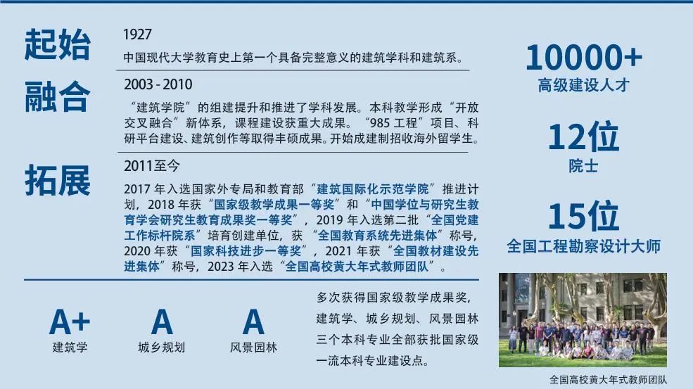 东南大学的建筑教育起始于1927年,是中国现代大学教育史上第一个具备完整意义的建筑系(科),她持续引领中国建筑教育的发展,同时也是中国最重要的建筑类科学研究基地之一。学院设有建筑学、城乡规划两个一级学科和风景园林专业学位类别,在全国第五轮学科评估中,建筑学获评A+、城乡规划和风景园林均获评A,取得历史最好成绩。学院历来重视人才培养,多次获得国家级教学成果奖,建筑学、城乡规划、风景园林三个本科专业全部获批国家级一流本科专业建设点。2017年入选国家外专局和教育部“建筑国际化示范学院”推进计划,2018年获“国家级教学成果一等奖”和“中国学位与研究生教育学会研究生教育成果奖一等奖”,2019年入选第二批“全国党建工作标杆院系”培育创建单位,获 “全国教育系统先进集体”称号,2021年获“全国教材建设先进集体”称号,2020年获“国家科技进步一等奖”,2023年入选“全国高校黄大年式教师团队”。九十多年来,万博manbetx官网 为国家培养了10000多名高级建设人才,包括吴良镛等12位院士,张开济等15位全国工程勘察设计大师,以及世界建筑领域最高奖普利茨克建筑奖中国首位获得者王澍教授等杰出人才。