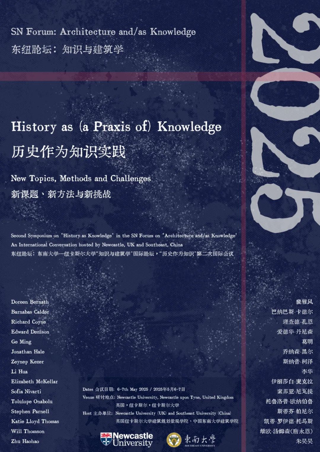 纽卡斯尔大学建筑规划与景观学院和万博manbetx官网 于2024年3月在中国南京举办了“东纽论坛”(SN Forum)第一次国际会议——“历史作为(能动的)知识”。演讲者探讨了历史知识对于建筑设计和遗产保护的赋能作用等多方面议题。2025年5月,“东纽论坛”第二次国际会议在英国纽卡斯尔举办,邀请学者开拓建筑历史学的前沿理论和创新解读,回应上述或其他问题所带来的新挑战。两次国际会议,都试图汇聚多文化的研究和讨论。东南大学与纽卡斯尔大学围绕“知识与建筑学”在二十一世纪的新关系这一核心问题,持续举办国际会议,主题从“历史”推向“地理”和“视图”。