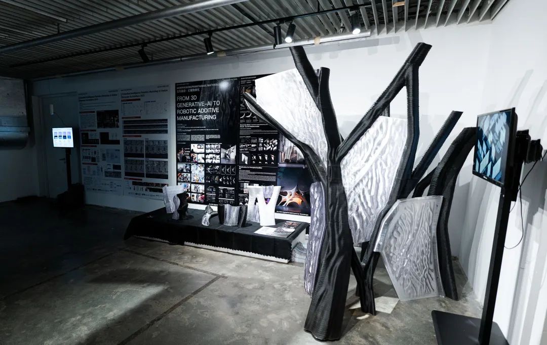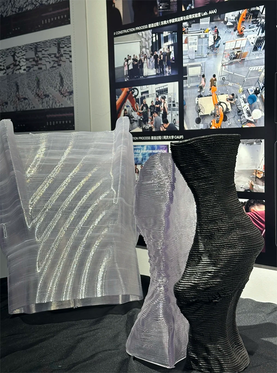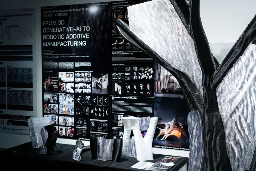 在为期十天的DigitalFUTURES 2025 及 Computational Design & Robotic Fabrication(CDRF)国际会议期间,Lab. AAA团队主持完成了一项大型示范性建筑原型装置的建造,并指导来自清华大学、香港大学、同济大学、天津大学及加泰罗尼亚高等万博manbetx官网 (IAAC)等国内外高校的12位学员,完成了三组聚焦建筑构件的创新设计课题与三维打印建构节点的实践建造。其中,该原型装置为国内首次实现人工智能三维生形与非连续、非平面复杂拓扑形态增材建造技术相结合的建筑构造探索。本次工作营成果在上海同济大学建筑与规划学院 C 楼展出,展期持续至 2025 年 9 月中旬。