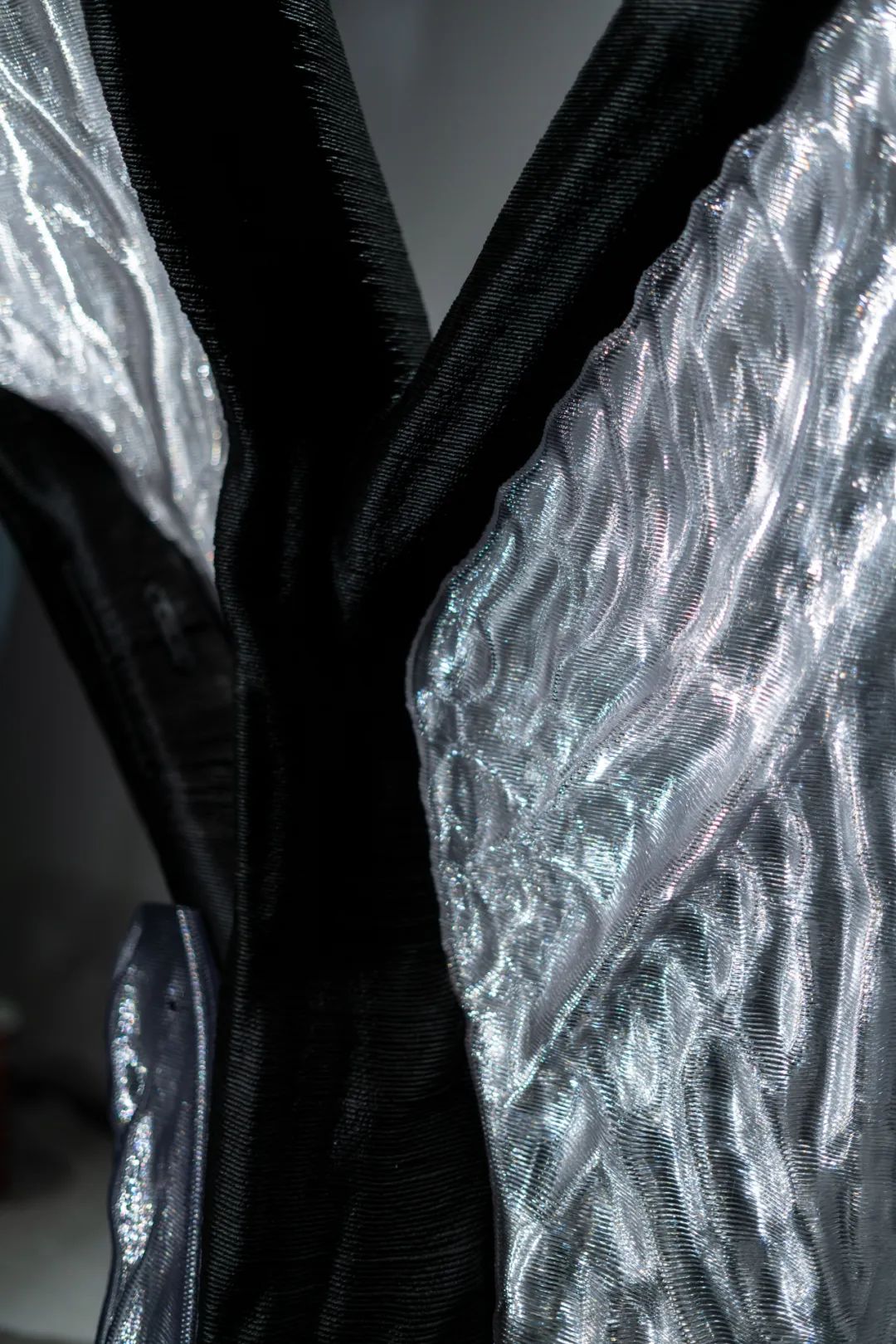 该装置整体形态抽象自龙骨结构支撑与透明围合连接的建筑构造原型,尺寸约为2米× 2米× 2.3米。其黑色结构部分采用30%玻璃纤维增强的高分子聚合物(GFR-PETG),白色部分为高透明可回收改性PETG材料。项目基于机械臂增材制造技术完成大构件打印并装配完成。由于AI生成几何形态的高度拓扑复杂性,项目在建造过程中开发了多项控制技术,包括非平面与非连续打印控制、构件智能分区与路径优化、局部几何适应式变速打印(挤出速度、移动速度等),以确保建造过程的高效率与高精度。