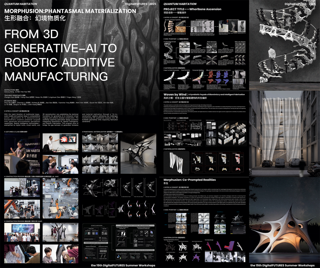 2025年6月28日至7月6日,万博manbetx官网 建筑运算与应用实验室(Lab. AAA)的王大嵩助理研究员、华好副教授以及五位研究生助教共同指导了DigitalFUTURES 2025 国际工作营,主题为“生形融合:幻境物质化——从三维生成式人工智能到机械臂增材建造”(Morphusion: Phantasmal Materialization - From Three-Dimensional Generative AI to Robotic Additive Manufacturing)。该工作营基于东南大学Lab. AAA的最新研究成果,聚焦生成式人工智能、空间智能与机器人建造技术的融合,探索“AI-Construction”集成工作流下的推测性设计方法。核心议题是如何在建造约束条件下,从二维定性生成过渡至三维复杂构形的技术路径,实现从人工智能“幻境生成”到机械臂“物质化建造”的维度转译。