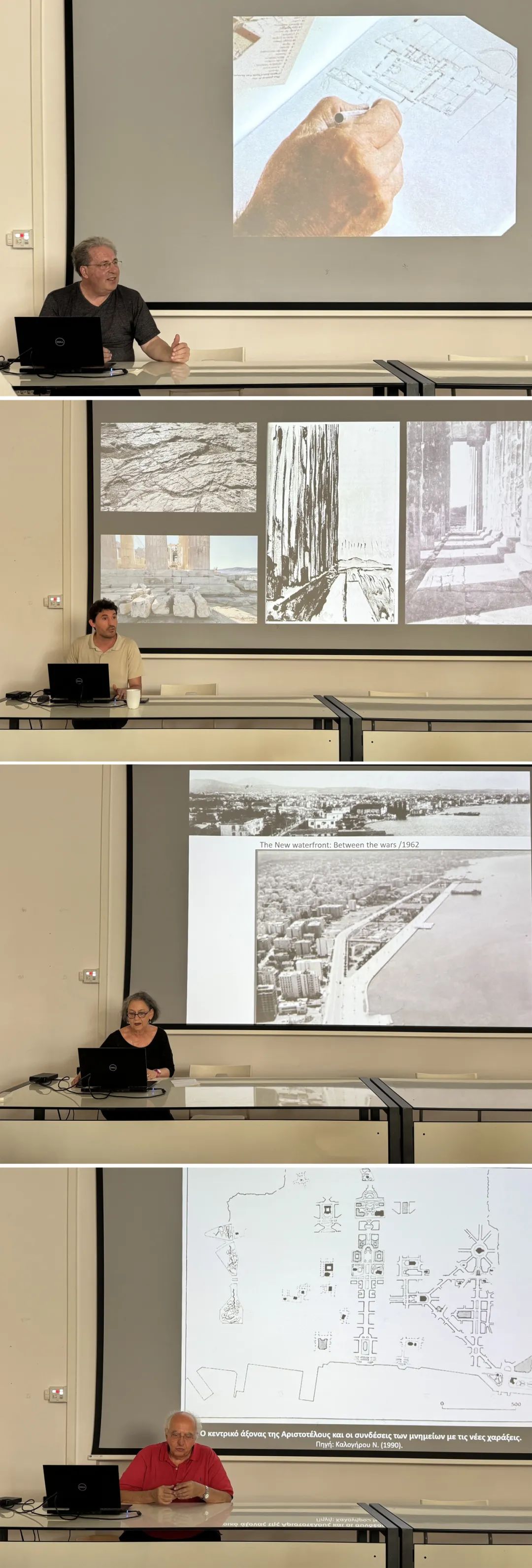 前期准备阶段,亚里士多德大学的Sofoklis Kotsopoulos教授在线上为东南大学学生介绍了塞萨洛尼基的历史语境及其UNESCO世界遗产。工作营开始后,来自亚里士多德大学的Alkmini Paka教授以塞萨洛尼基港口沿线发展为主题,梳理了塞萨洛尼基的历史变迁,Nikolaos Kalogirou教授介绍了塞萨洛尼基的亚里士多德轴线,正是这个一百多年前设计的轴线为现代塞萨洛尼基打下基础。来自东南大学的莱瑟巴罗教授以场地调研切入,启发同学们以速写、模型、摄影等不同方式理解场地,并再现和重构场地;Antonios助理教授则从西方建筑中的人体尺度的视角,提出形式、材料、历史等一系列问题。这些讲座带领同学们了解历史,注视当代,并反思自我持有的习惯性设计观念。