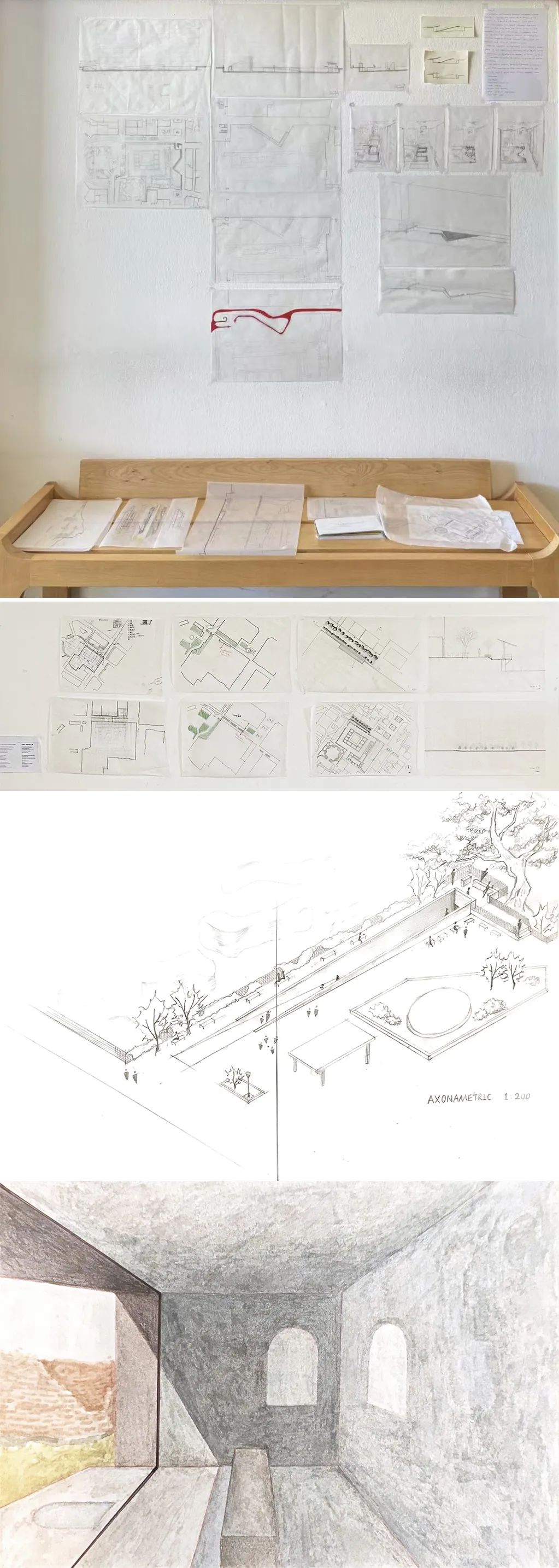 窗(window)——位于场地西北部的纳瓦里努广场,如今是塞萨洛尼基颇受年轻人喜欢的公共场所。工作营通过引入“窗”这个建筑元素,强调了“看”的动作,也带来关于“如何看遗址”的设计思考。第三小组正是在这一设计方向上,分析视线与光影,既设计全景式的观看路径,也探索潜望镜式的聚焦观察。