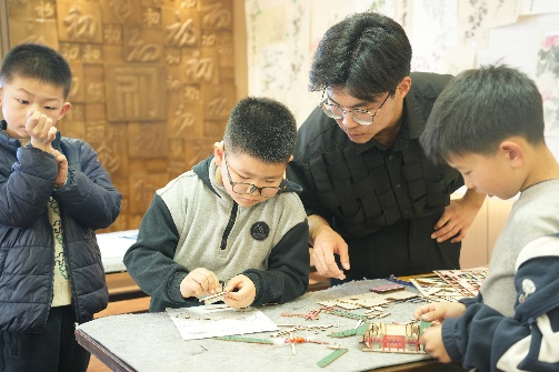 在模型拼装环节,支部党员创新设计"1+4"结对模式,1名党员指导4名儿童完成天安门、岳阳楼、大雁塔等模型的组装。当孩子们在党员示范下成功将榫头嵌入卯眼时,四年级学生乐乐(化名)兴奋地说:"这个凹凸结构比乐高还有意思!