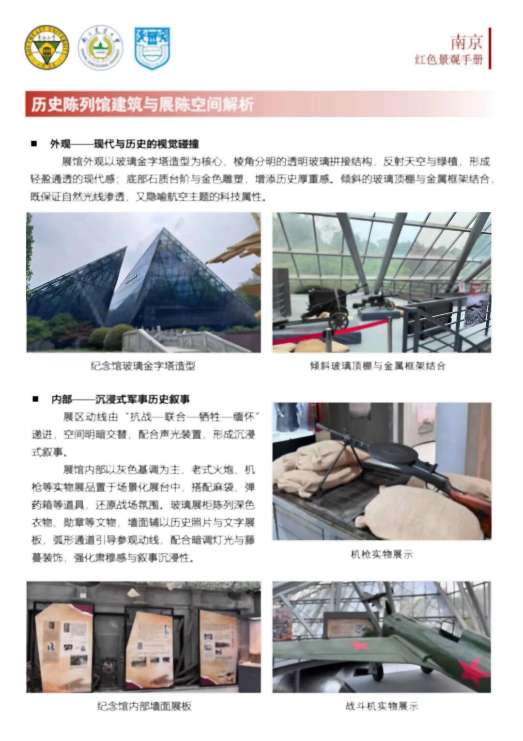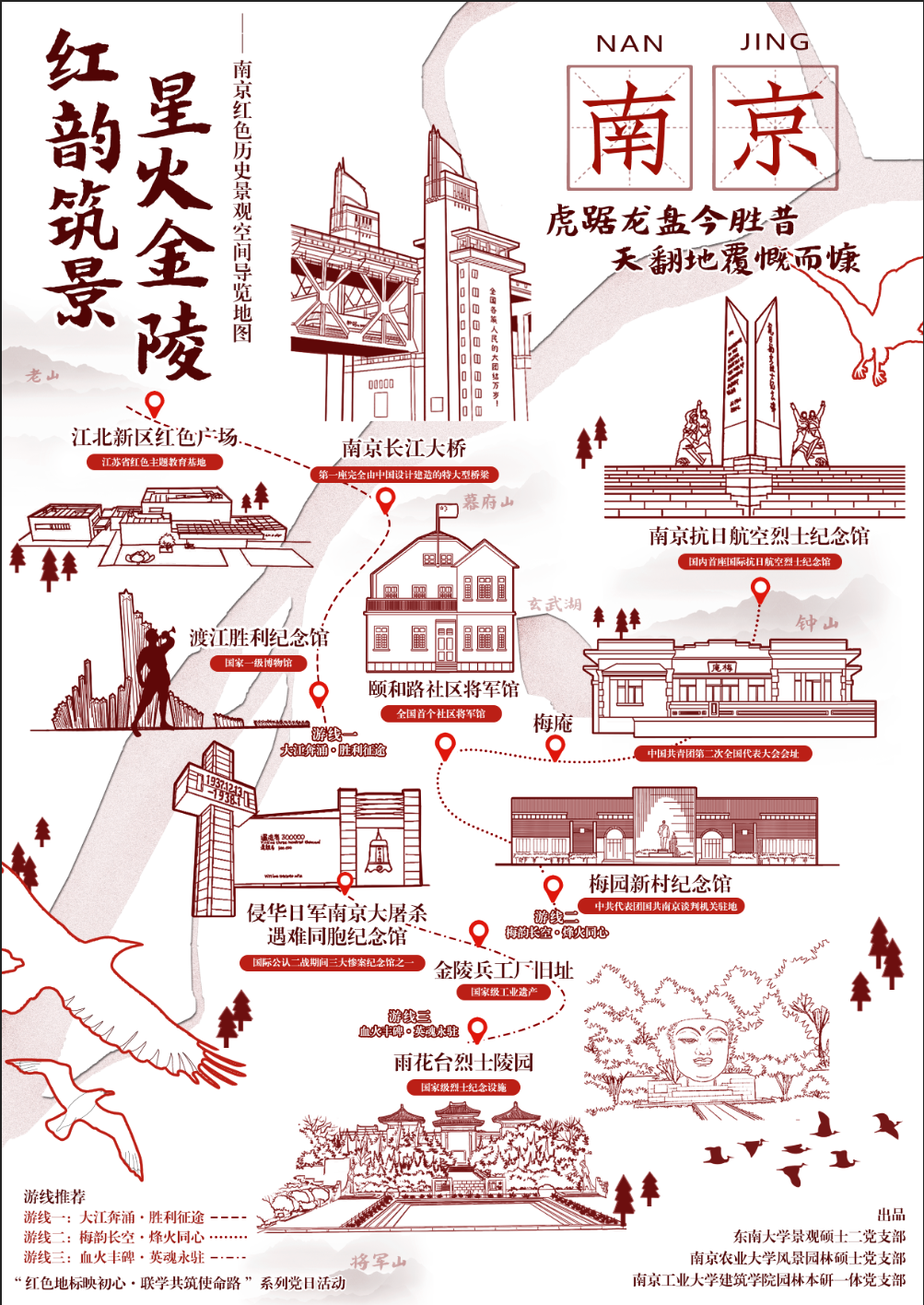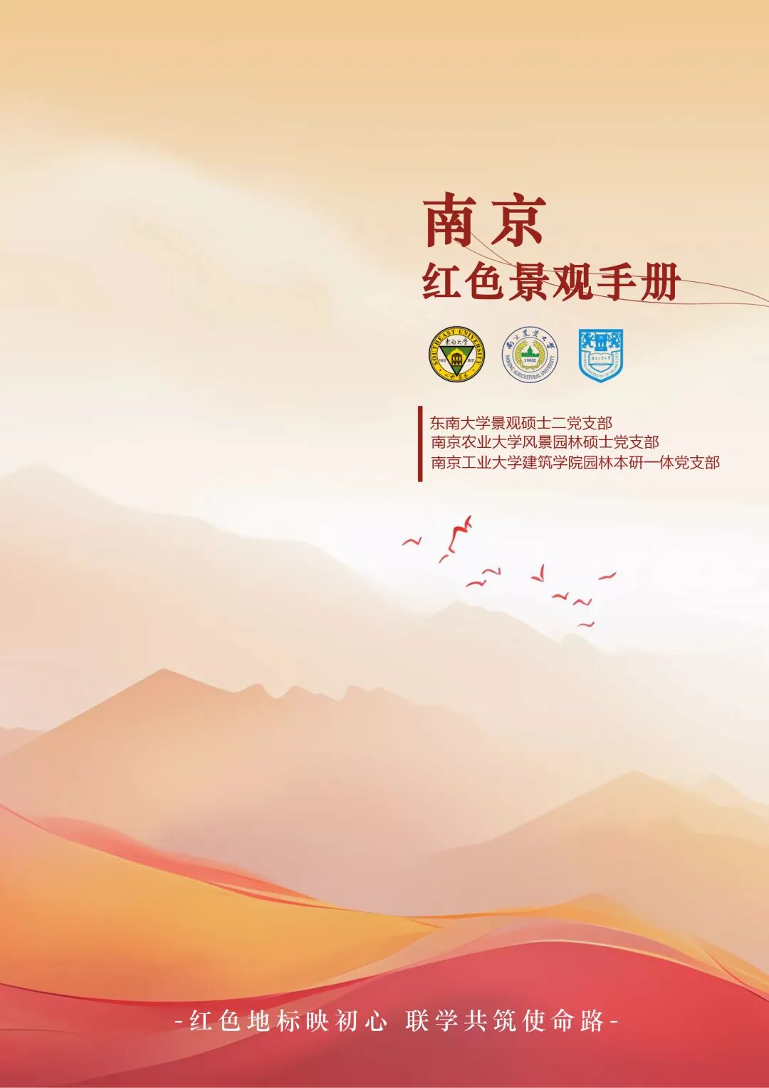 与传统的对红色景观的梳理介绍不同的是,该手册从风景园林专业的视角出发,梳理了十处具有代表性且空间设计独居匠心的南京红色地标,并绘制南京红色景观地图;基于实地走访与素材采集,围绕十处红色景观的红色文化价值、景观空间特色与历史环境延续等维度进行专业化解析,并据此规划了三条主题鲜明的红色研学游线: “大江奔涌·胜利征途”、 “梅韵长空·烽火同心”、 “血火丰碑·铭记之路”。