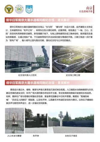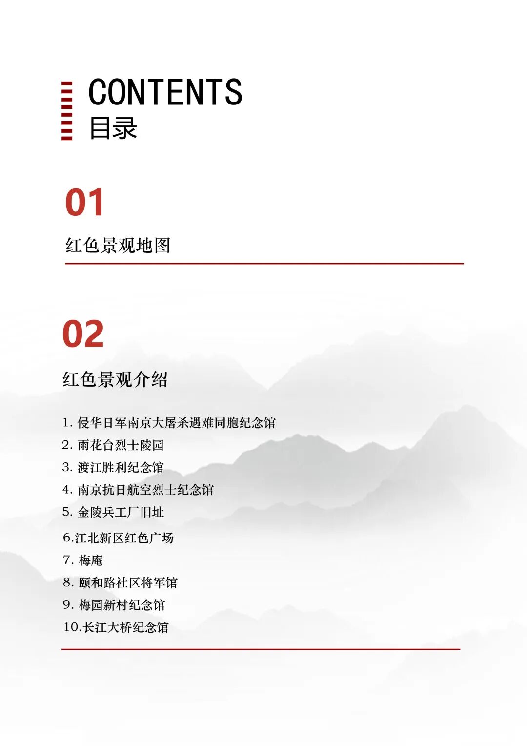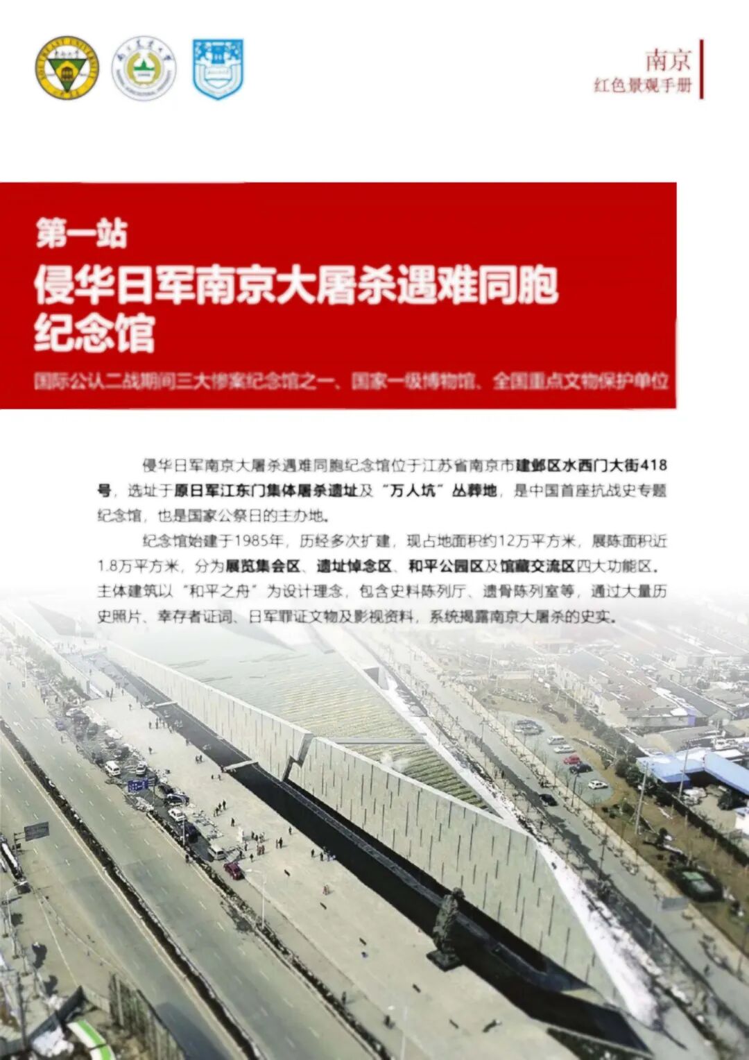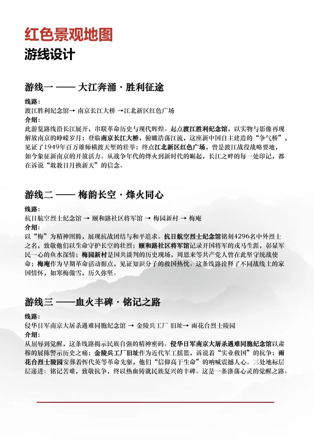 与传统的对红色景观的梳理介绍不同的是,该手册从风景园林专业的视角出发,梳理了十处具有代表性且空间设计独居匠心的南京红色地标,并绘制南京红色景观地图;基于实地走访与素材采集,围绕十处红色景观的红色文化价值、景观空间特色与历史环境延续等维度进行专业化解析,并据此规划了三条主题鲜明的红色研学游线: “大江奔涌·胜利征途”、 “梅韵长空·烽火同心”、 “血火丰碑·铭记之路”。