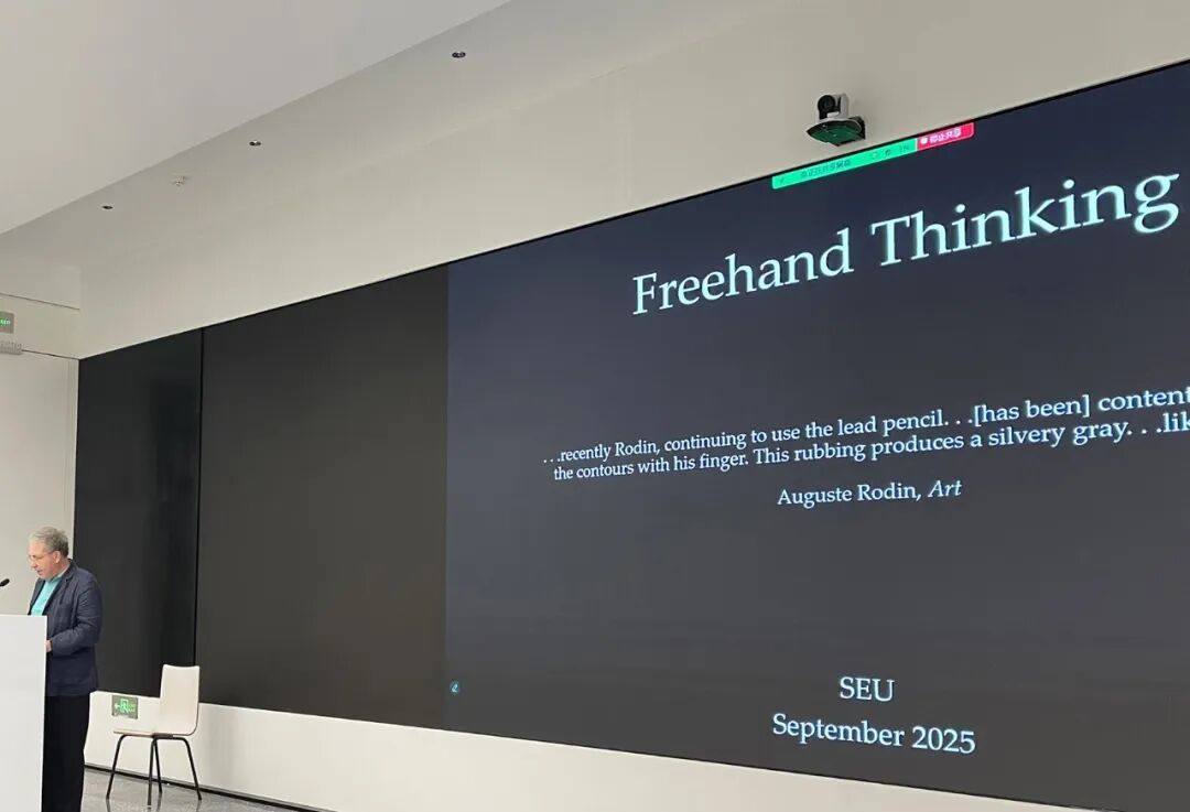 演讲环节结束后,嘉宾与听众展开了热烈的学术交流。短暂茶歇后,东南大学建筑国际化示范学院院长戴维·莱瑟巴罗(David Leatherbarrow)教授发表了“以手思考”为题的主旨演讲。莱瑟巴罗教授指出,应在区分不同艺术实践的基础上展开对话,避免将某一艺术的期待强加于另一种之上。他强调,尽管艺术形式各异,某些技能与知识仍可跨越边界,实现共鸣。在绘画与建筑设计过程中,不仅是大脑在思考,手同样参与认知与创造。演讲结束后,与会嘉宾共同前往北丘当代美术馆参观。