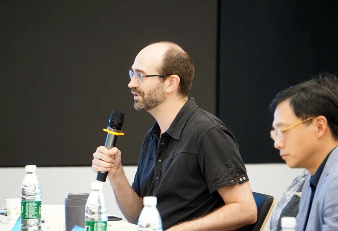 在演讲环节结束后,嘉宾们围绕“数智时代的艺术与设计”展开了热烈讨论。AI作为设计与艺术创作的新兴手段,引发了关于其能否替代人类艺术创造的深度思考。在技术快速迭代的今天,艺术的存在价值何在?建筑教育中的艺术教学又应如何回应AI带来的挑战与机遇?这些问题激发了现场多角度的思辨交流。短暂休会后,与会者共同观看了瑞士艺术家萨比娜·赫蒂格新近完成的3D影片。该作品以数字媒介为载体,呈现出艺术与建筑交叉、碰撞并融合的视觉形态,在沉浸式体验中拓展了艺术与建筑对话的美学维度。
