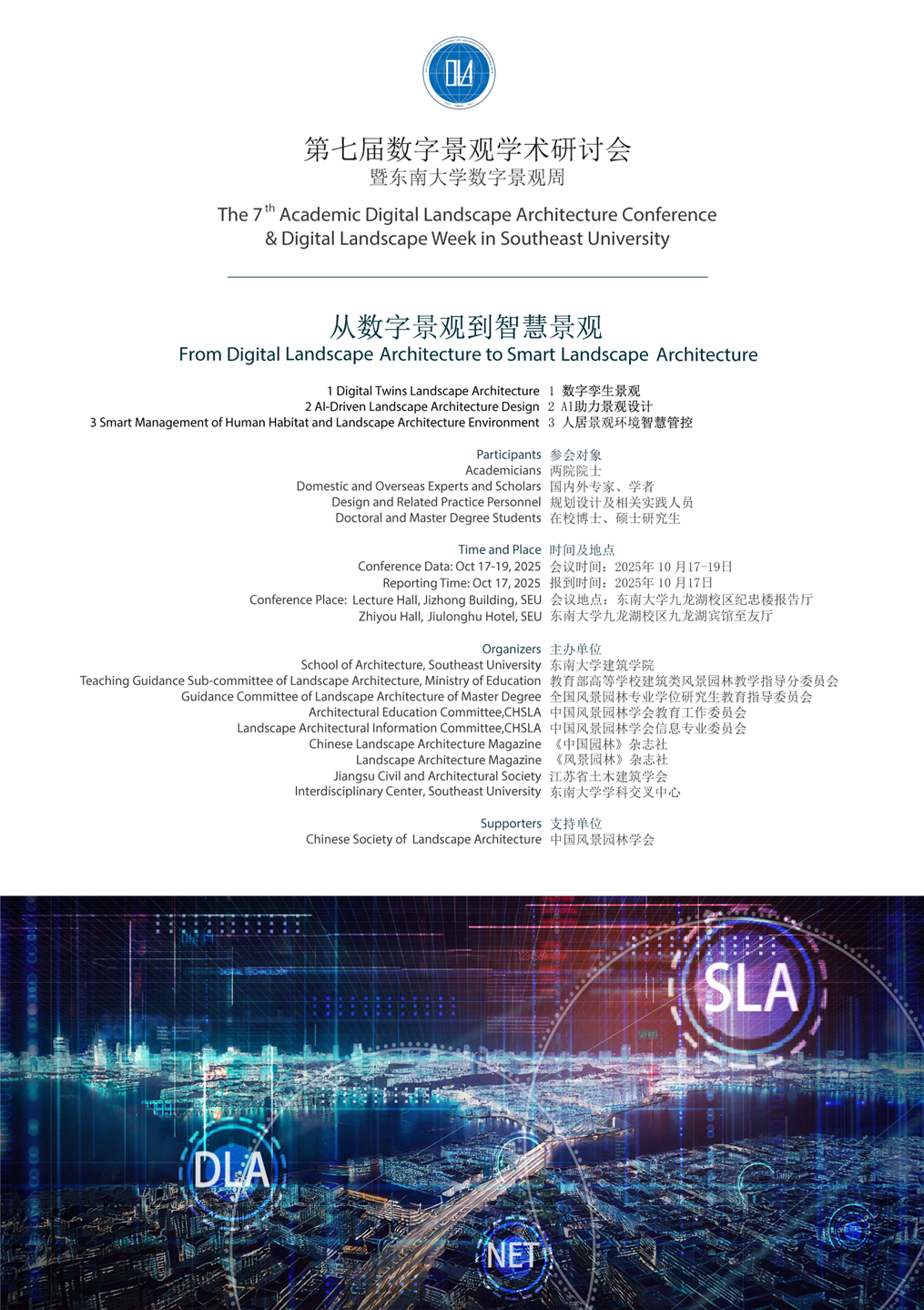 作为教育部批准设立的系列学术研讨会,继2013、2015、2017、2019、2021、2023年成功举办六届研讨会后,2025年10月17—19日将在东南大学九龙湖校区召开“第七届数字景观学术研讨会”。现就有关事项通知如下: