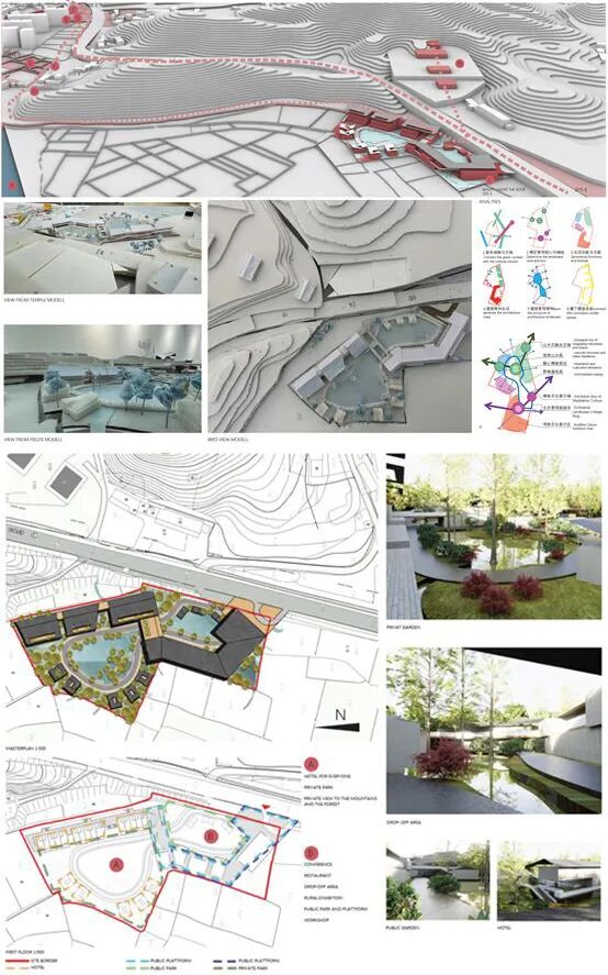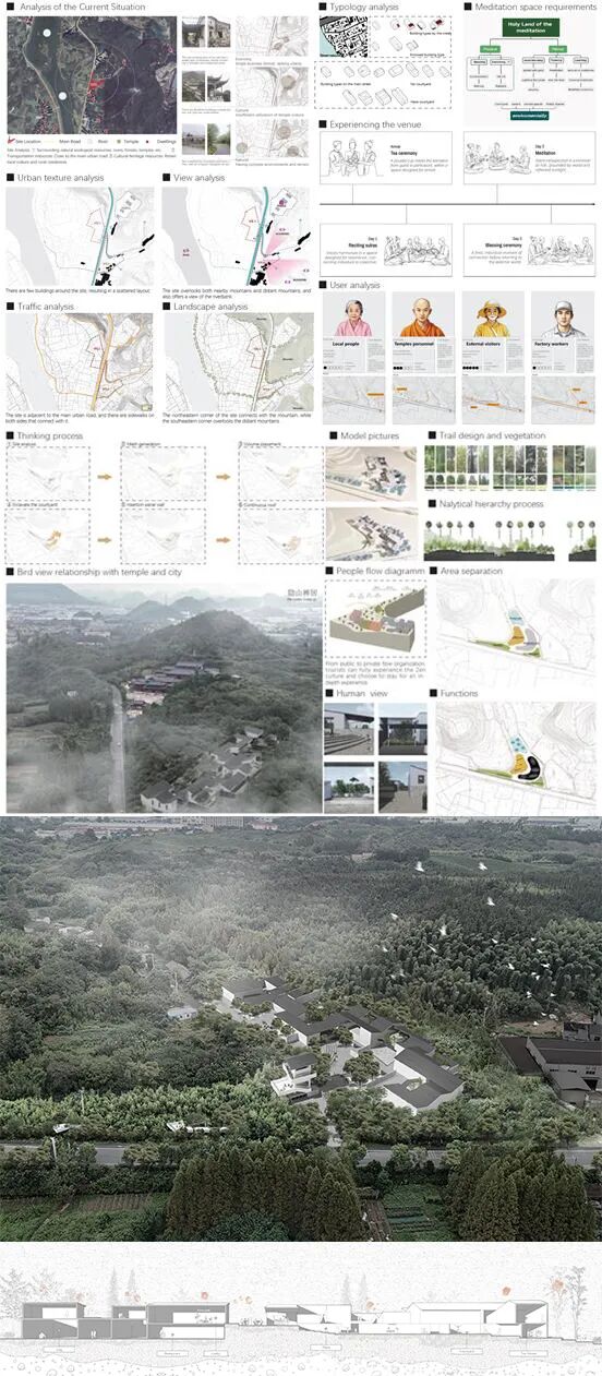 地块6隐于老虎山南麓,具有典型的山地特征。考虑到复建中的南五台寺功能配置不全,设计将其定义成寺院和周边企业的禅学主题服务设施。设计从场地结构出发,依据等高线渐次设计公私区域。院落化的空间结构展现了静谧的环境氛围的同时,强化了周边景观的渗透。