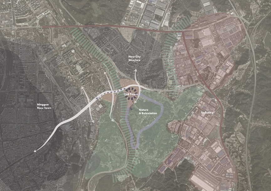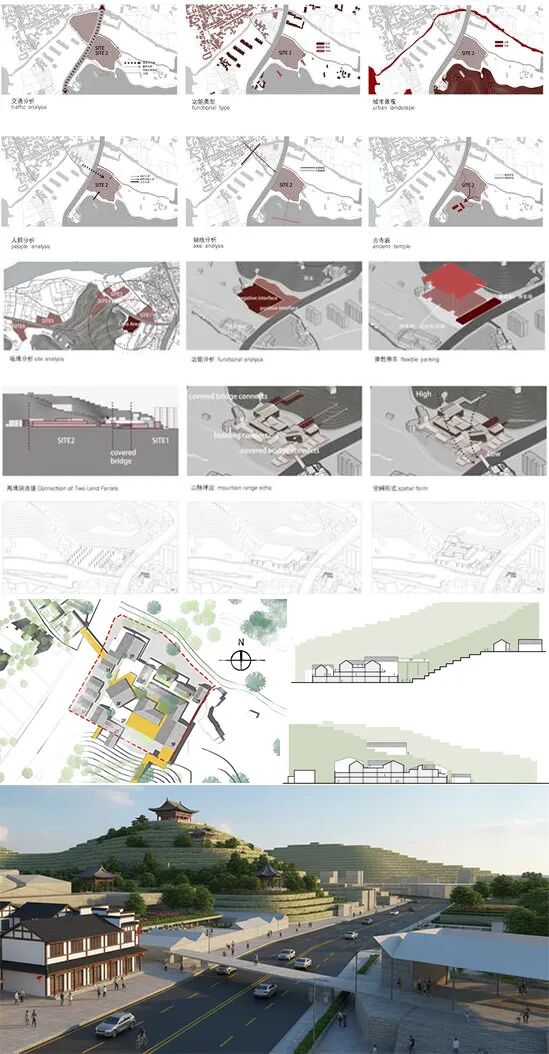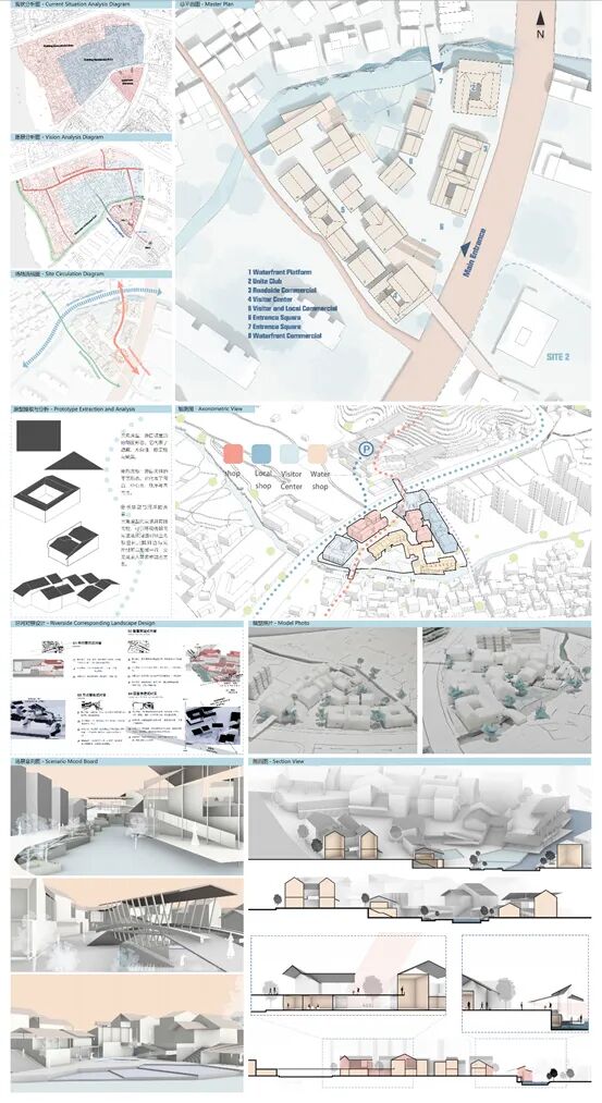 地块1处于老街片区的东南侧,规划建议将其作为未来整体开放公园的门户,主要实现对老街的游客服务、展示和综合配套功能。设计优化了动线结构,将原住民和游客的流线做了合理分流,并与隔街相望的Site2通过二层步道系统相连。设计强化了对老街界河周边的空间设计,使其成为两侧城市空间的内向景观廊道。通过对老街空间原型的提取与三维组织,构建了具有地方空间特色的街道景观。