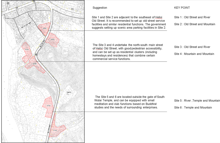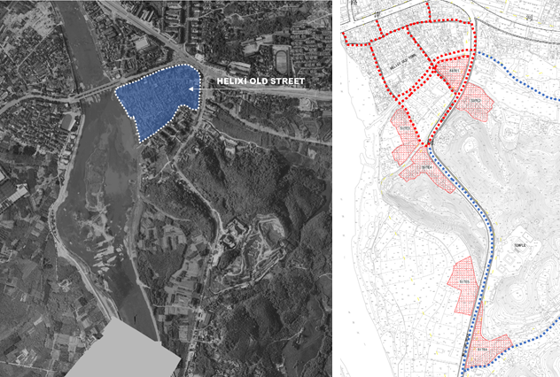 本次联合教学选择了河沥溪老街外围的6个地块,分别位于老街片区的东南,次街南侧,及邻近南五台寺地段,并两两相邻。选地原则旨在通过对外围地块的设计,优化老街线性的空间组织,以更为合理的闭环路径实现老街游历的体验。选地未深入老街内部未更新区域,旨在保持既有的居民生活空间格局,通过外围边界空间的优化及结构的调整,为后续的自主更新创造条件。相邻的两个设计地块针对既存文脉、山地条件、水域景观等不同的设计问题,并彼此之间存在空间结构上的潜在联系,需要各组在设计中保持一定的协同。