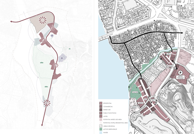 地块3和4彼此相邻,北向承接老街,西侧有步行小径通往河滨。两个地块之间存在近3米的高差,且南侧山体环抱,景观资源优越。设计组建议两个地块以类居住功能为主,集合居住、民宿、酒店等复合性业态,并结合高差,建立场地内外的立体步行交通联系。设计通过对老街居住形态的研究,采用类似的小组团布置方式,充分体现了对环境的包容性。