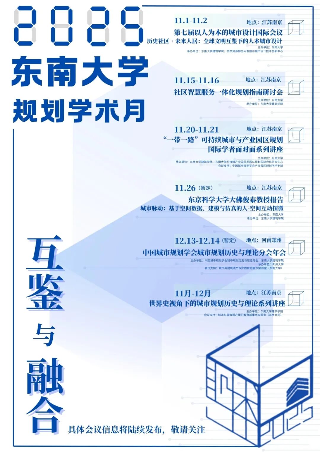 城乡规划学科正处于全球文明交汇与技术革新的时代交点,城乡发展如何在多元文化互鉴中融合人文关怀与科技智慧,成为规划学科亟需破解的时代命题。2025年东南大学规划学术月以“互鉴与融合”为主题,围绕人居发展、社区服务、城市设计、产业园区、城市韧性、规划历史等议题,邀请来自全球不同地区和不同文化背景的规划、建筑、地理、管理、遗产保护等多领域学者,展开跨文化、跨学科的深度学术交流,以期在互鉴中激发创新力量,在融合中吸纳科技智慧,共同推动城乡规划学科面向新时代的持续发展。