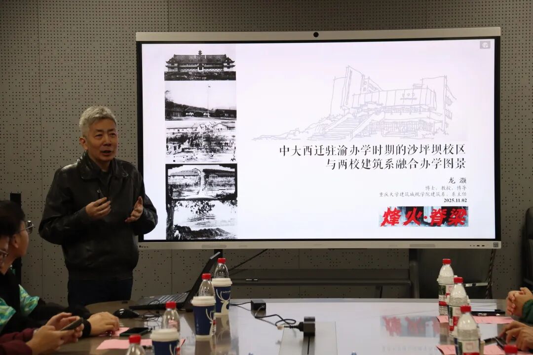 座谈会前,龙灏老师作《中大西迁驻渝办学时期的沙坪坝校区与两校建筑系融合办学图景》讲座,从背景概述与共克时艰两个方面出发,详细介绍了两校在抗战期间的关系与渊源。彼时两校建筑系仅相距直线距离800米,杨廷宝、童寯等多位老师同时在两校任教,且当时两校之间学生转学情况时有发生。龙老师强调,我们要铭记历史,牢记先辈们的艰苦奋斗,两院更应加强联系,携手应对挑战,共同肩负起培养卓越人才、服务国家建设的使命。