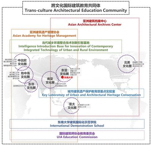 在“建筑国际化示范学院”的框架下,依托当代城乡环境整合技术创新引智基地、中华民族视觉形象研究基地、城市与建筑遗产保护教育部重点实验室等教研平台以及UNESCO亚洲遗产管理学会秘书处、亚洲建筑档案中心等国际学术机构,联合世界各主要文化圈一流建筑院校构建跨文化建筑教育网络。成建制引进国际师资,依托国际文化机构和国际合作培养项目,多渠道开展覆盖专业课程与实践环节的教学合作,共建共享优质教学资源库,实现长期课程+短期研学、远程+实地、线上+线下的多元教学模式,在跨文化交流中取得显著培养成效。