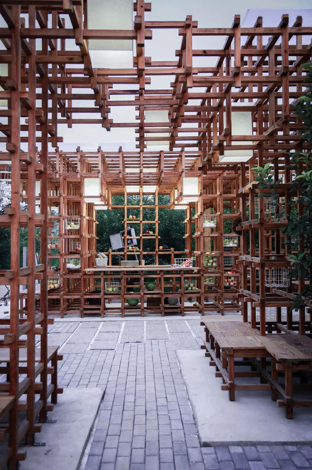 模块化的空间中被填入了不同的功能,既可以放置吊灯,又可以盛放果篮。柔和的灯光、诱人的水果与模块紧密结合,又很好的实现了鲜果售卖的功能,同时灵活可变,赋予了整个建筑新的活力。