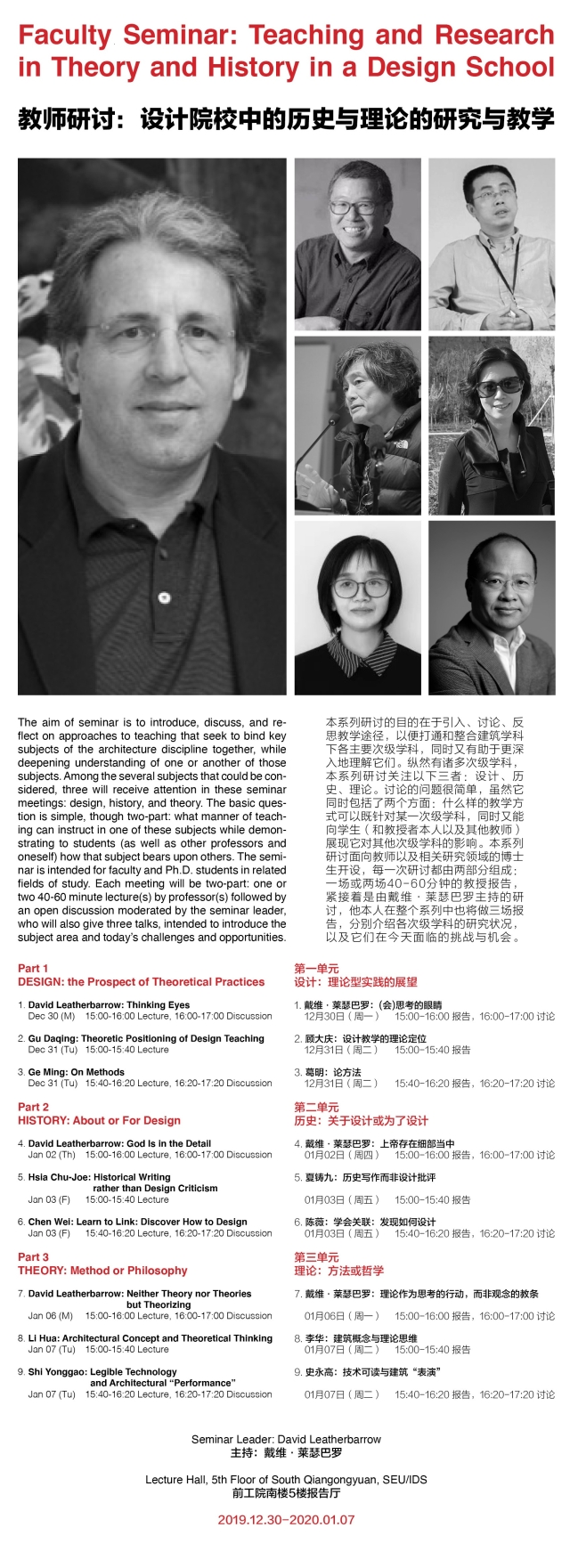 The aim of seminar is to introduce, discuss, and reflect on approaches to teaching that seek to bind key subjects of the architecture discipline together, while deepening understanding of one or another of those subjects. Among the several subjects that could be considered, three will receive attention in these seminar meetings: design, history, and theory. The basic question is simple, though two-part: what manner of teaching can instruct in one of these subjects while demonstrating to students (as well as other professors and oneself) how that subject bears upon others. The seminar is intended for faculty and Ph.D. students in related fields of study. Each meeting will be two-part: one or two 40-60 minute lecture(s) by professor(s) followed by an open discussion moderated by the seminar leader, who will also give three talks, intended to introduce the subject area and today's challenges and opportunities.