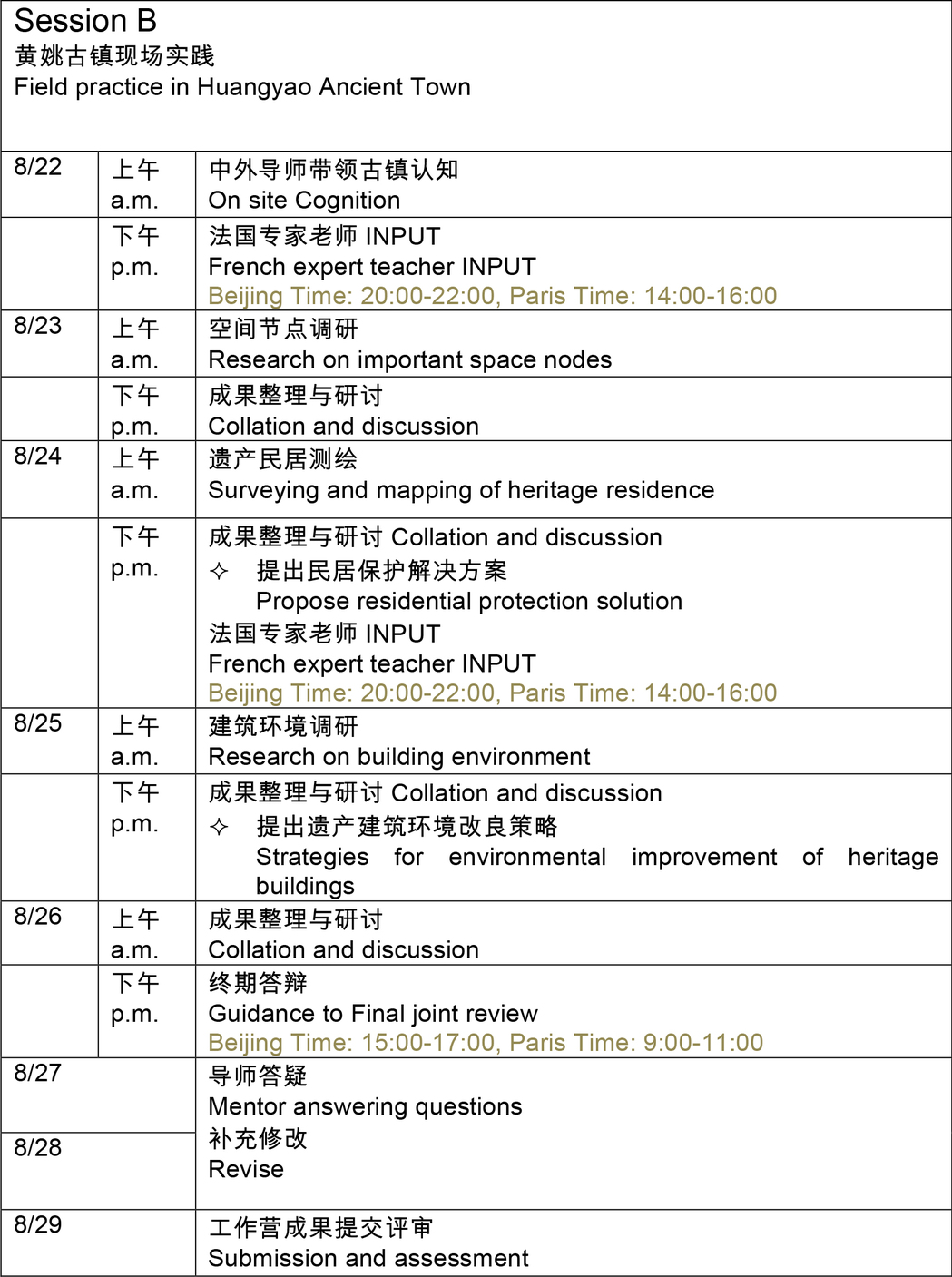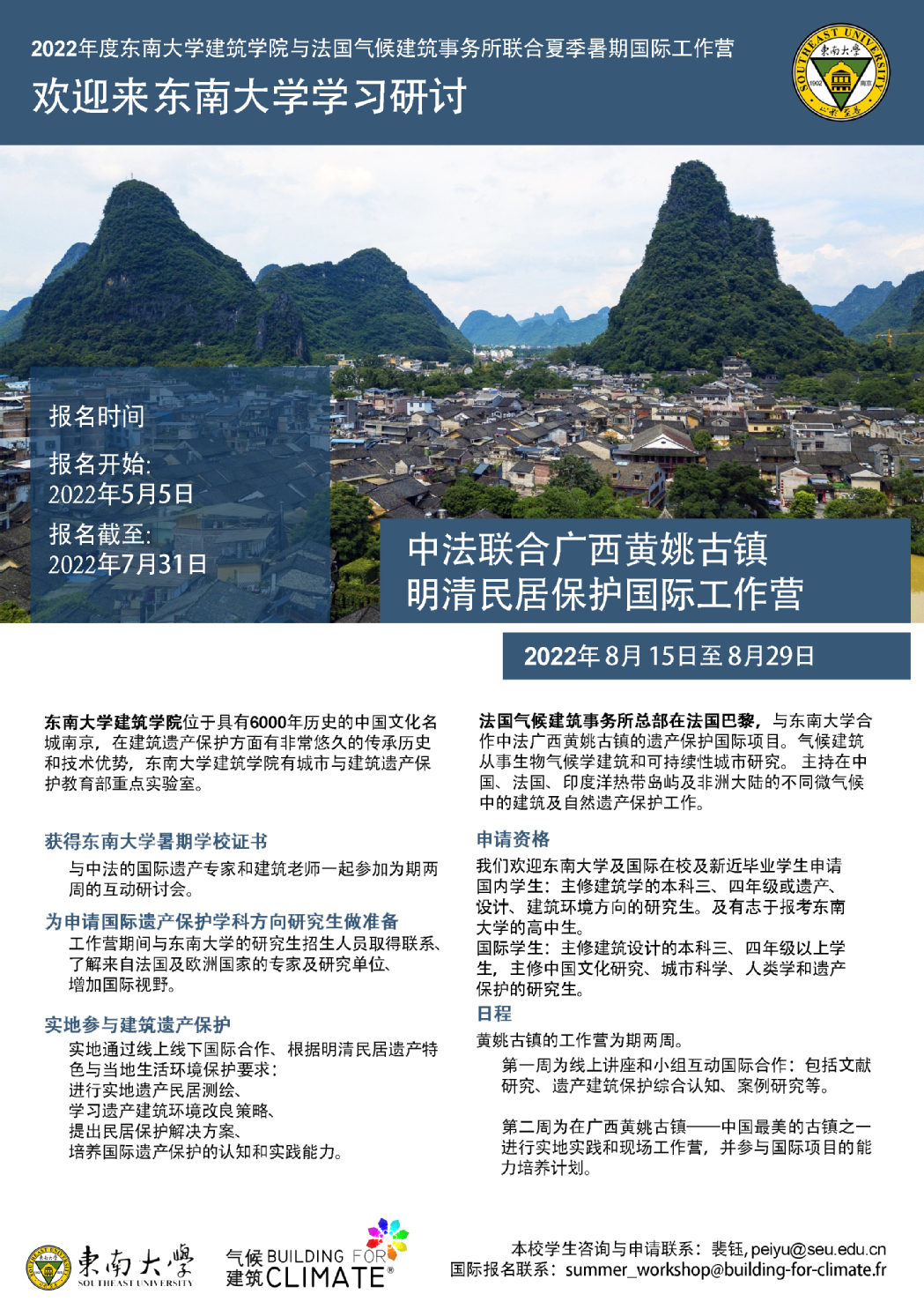 黄姚国际工作营包括线上讲座与线下实践,以快节奏的教学工作形式,让学生重视古民居的舒适度,并根据古民居的生物建筑环境和遗产保护要求进行模拟国际合作、提出综合方案,培养中国与国际新一代历史建筑遗产保护及相关专业学生对遗产保护的认知与现场实践合作能力。本次黄姚古镇中法工作营将于2022年8月15日至8月29日举行,完成课程的学生可获得东南大学暑期学校证书,欢迎国内外对本课程感兴趣的同学报名!