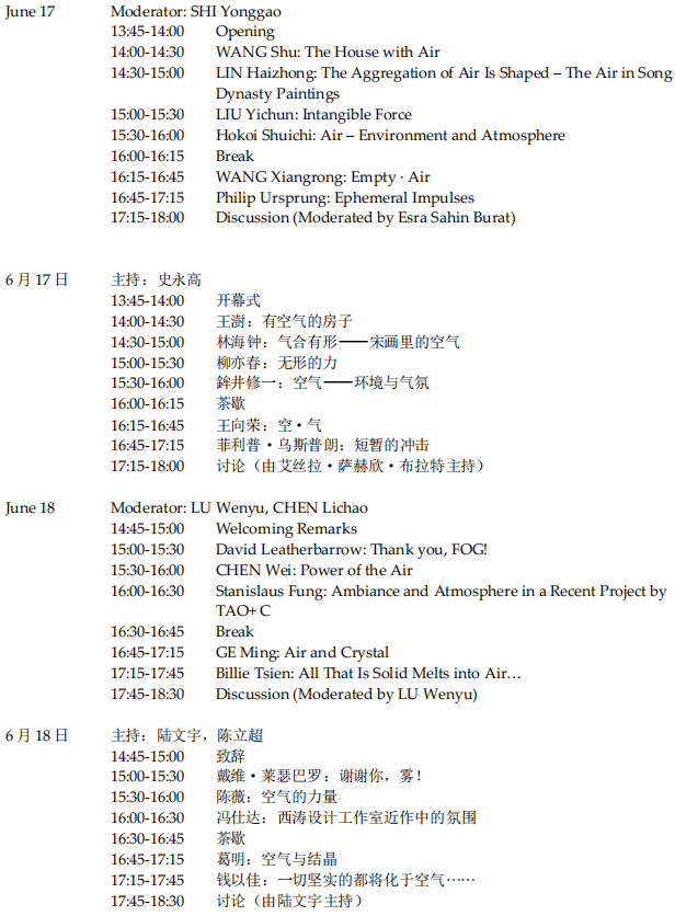 Air is not only all around us, but in and through us, as well as our buildings and landscapes, enlivening as much as qualifying them, dissolving ostensible boundaries between works and their worlds, in much the same way that a tree’s leaves and branches come to life when the wind blows, or the way wind in its sails moves a boat forward. Buildings, gardens, and paintings that breathe their several milieux might well be the works in and with which contemporary culture would like to live.空气不仅萦绕在我们体外,同时也充盈并流淌于其中。亦如其之于建筑与景观,空气为它们注入生气,同时也赋予它们意义与价值,并消解了作品与所处世界之间的表象边界,犹如树的枝叶在风中呼吸、风帆推动船只前行。不乏一些建筑、园林以及绘画吐纳于多种意义上的周边环境中,这些作品或将构成当代文化适宜的生长土壤与共同的成长对象。Focusing on the ways windows and walls, fields, groves, and bodies of water breathe their ambient environments might help us get beyond the long-standing fixation on works of art as free-standing objects, designed to satisfy either of two distracting expectations: for striking form and imagery, or hyper-rationalized products of up-to-date technology.Neither of these options seems to have a productive future. A breathing or respiratory topography, however, might be a positive alternative for architecture, landscapes, cities, and our lives within them. 通过专注于窗户与墙壁、田野、树丛以及水体在其氛围环境中的呼吸方式,我们或许能够突破长期以来对艺术品的执念,即把它们视为独立于环境的物体,其设计意图无非追求引人瞩目的形式和图像,抑或成为过度理性的最新科技产物。然而目前看来,这两种令人纷扰的期待皆前景堪忧。相比之下,一种呼吸的、或者说吐纳的地形学将有可能替代传统认知下的建筑、景观、城市,并为其间的人类生活带来观念上的转变。This conference focuses on the often-overlooked role of air and its elements within the works of architecture, landscape, and painting. Recognizing and understanding the topographical play of air in these works may enhance modern architecture’s capability of accommodating and articulating the nuances of human life.本次会议关注在建筑、园林与绘画作品中往往被忽视的空气及空气中的元素。认识并理解空气在这些作品中起到的地形学上的作用,有助于让今日的建筑更好地容纳并表达人类的生活。1. Properties: physical properties of air, and various methods of tempering the environment by amplifying its inherent capacities.2. Atmosphere: sensory and psychological qualities of the air, and their role in contributing to the vibe and the mood of a place.3. Movements: respiratory exchanges that occur at boundaries, types of connections that modulate the flow of elements in air, and the actual and potential motion given to originally static objects. 4. Rhythms: tempos exhibited in the momentum of air, pulses of space configuration influenced by air filling the void, and principles of natural change guiding the beat of life and cadence of artifacts.1. 气-质:空气的诸多物理性质,以及通过增强空气内在特性的方式,用于调节环境的各种方法。